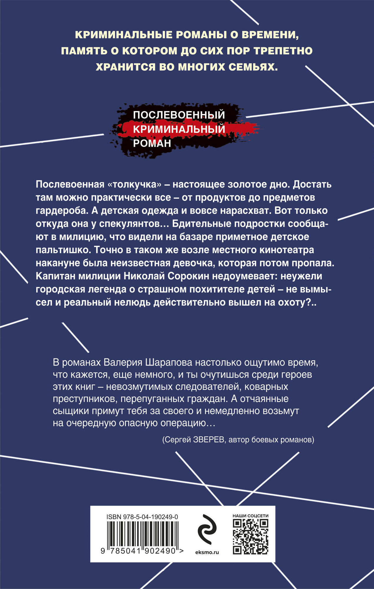 Послевоенная "толкучка" – настоящее золотое дно. Достать там можно практически все – от продуктов до предметов гардероба. А детская одежда и вовсе нарасхват. Вот только откуда она у спекулянтов… Бдительные подростки сообщают в милицию, что видели на базаре приметное детское пальтишко. Точно в таком же возле местного кинотеатра накануне была неизвестная девочка, которая потом пропала. Капитан милиции Николай Сорокин недоумевает: неужели городская легенда о страшном похитителе детей – не вымысел, и реальный нелюдь действительно вышел на охоту?..