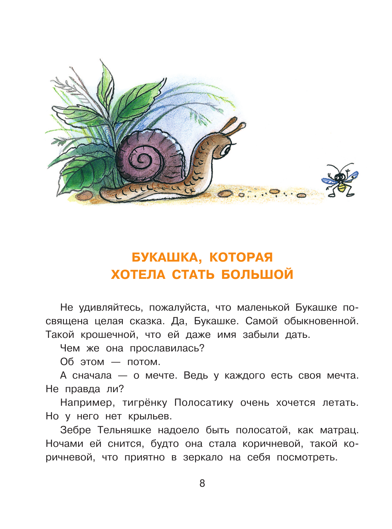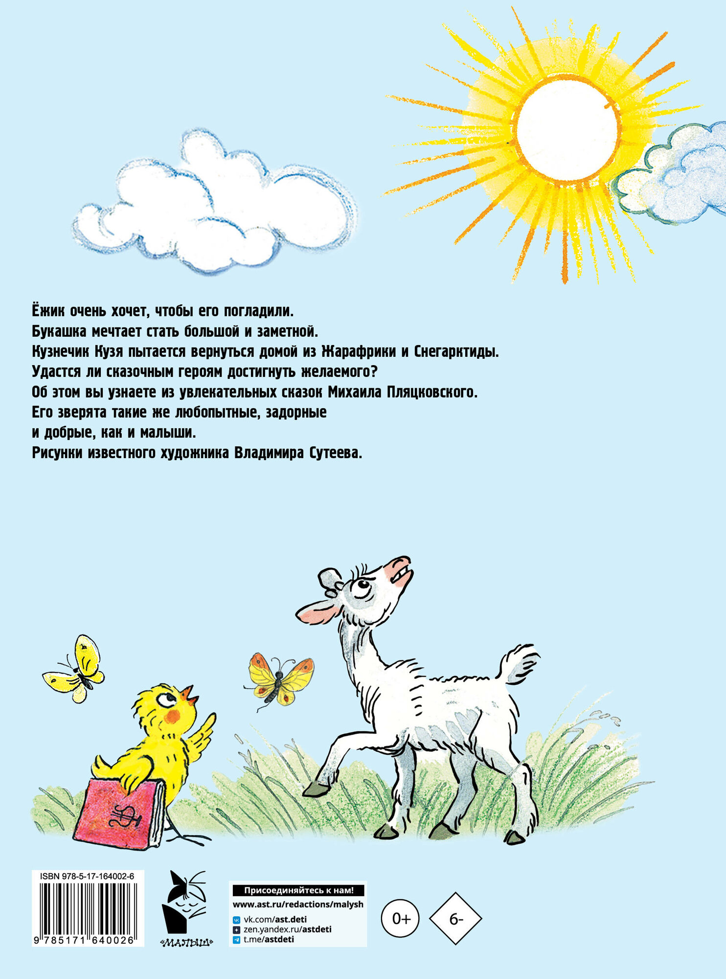Ёжик очень хочет, чтобы его погладили.Букашка мечтает стать большой и заметной.Кузнечик Кузя пытается вернуться домой из Жарафрики и Снегарктиды.Удастся ли сказочным героям достигнуть желаемого? Об этом вы узнаете из увлекательных сказок Михаила Пляцковского. Его зверята такие же любопытные, задорные и добрые, как и человеческие малыши.Рисунки знаменитого художника Владимира Сутеева.