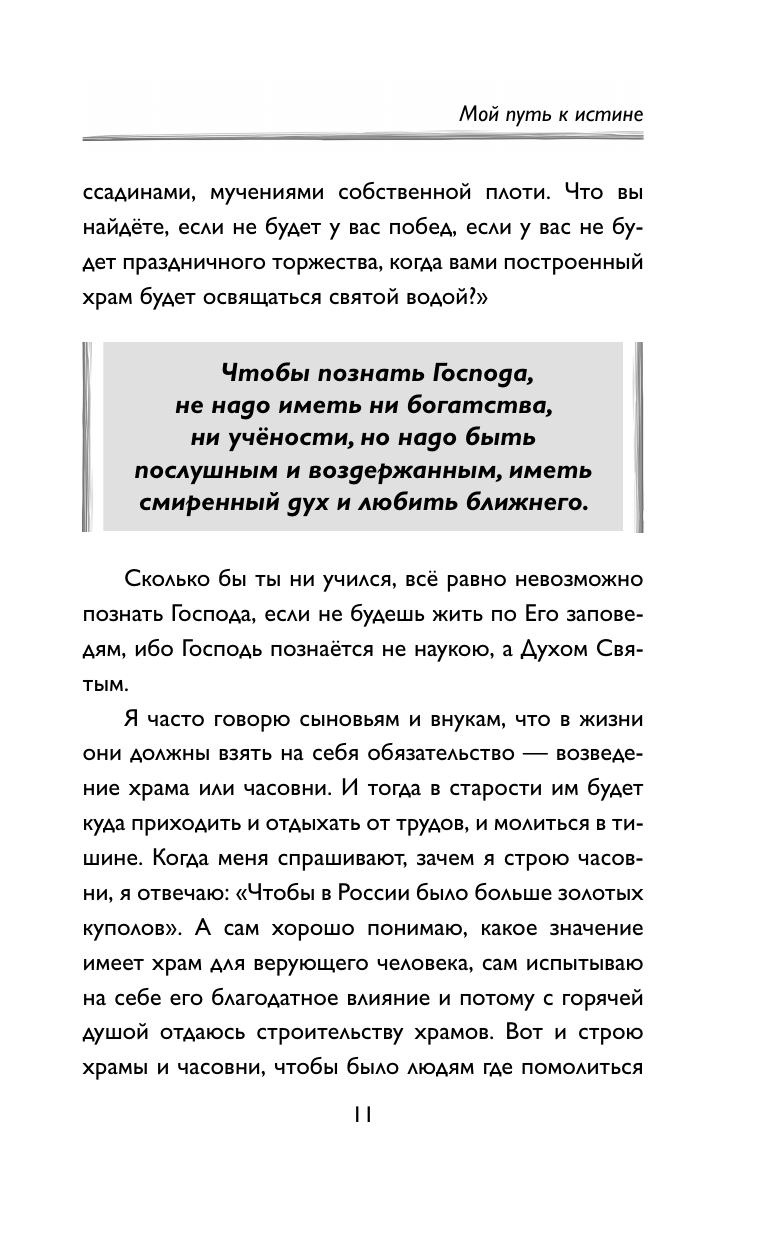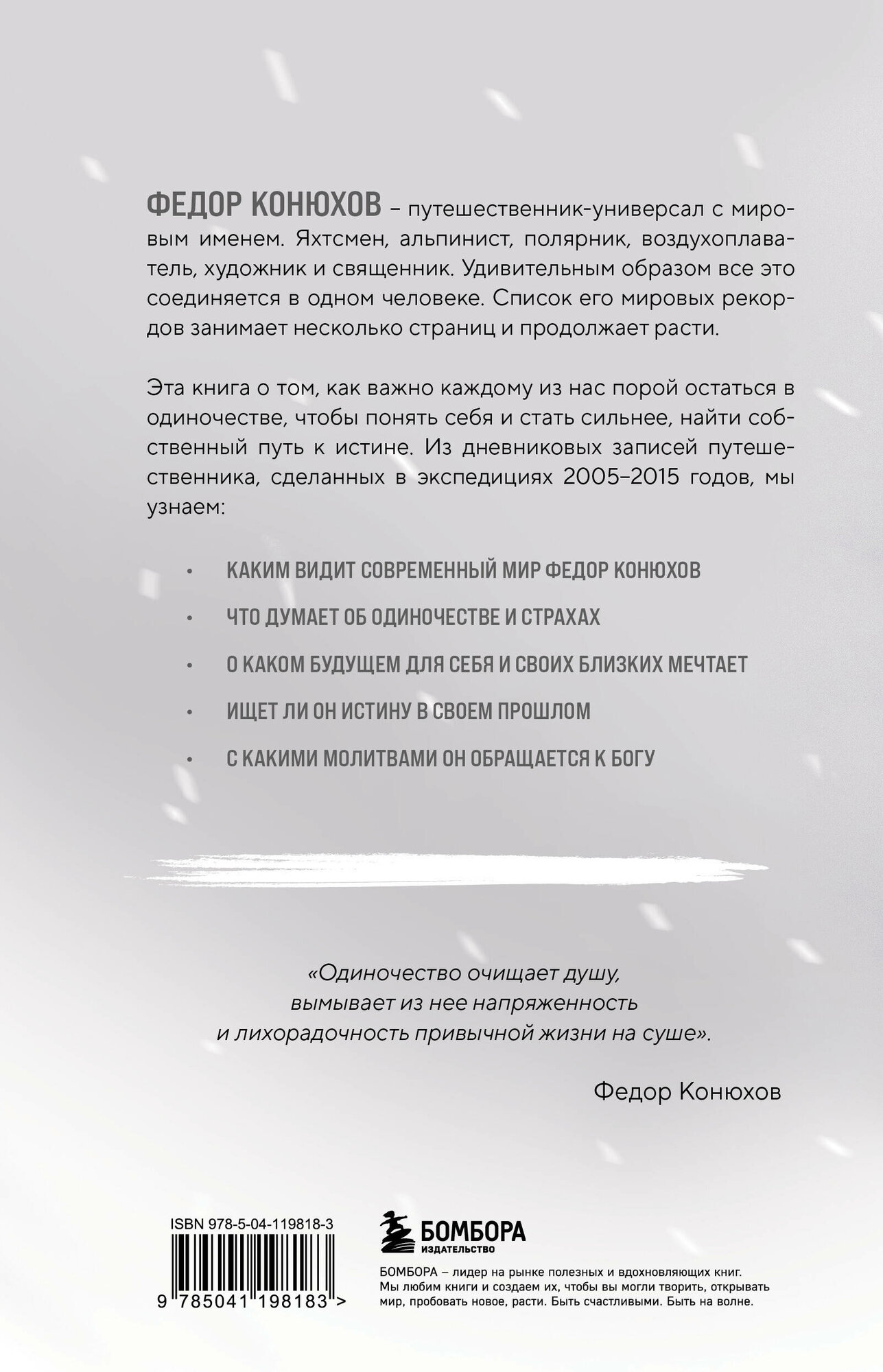 Всемирно известный российский путешественник Федор Конюхов большую часть своей жизни проводит в океанах, экспедициях к полюсам и высочайшим вершинам. Эта его книга о том, как важно порой каждому из нас остаться в одиночестве, чтобы понять самих себя и стать сильнее, а еще о том, почему строительство храма начинается с собственной души. Каким видит современный мир Федор Конюхов? Чем ценно для человека время, проведенное наедине с самим собой? О каком будущем для себя и своих близких мечтает автор? С какими молитвами он обращается к Богу? Оставшись один на один со своими мыслями, чувствами, мечтами и молитвами, путешественник, священник и художник получает возможность заглянуть в самые глубины своей души. Он делится своим уникальным опытом преодоления трудностей, сомнений и ошибок. "Одиночество очищает душу, вымывает из неё напряженность и лихорадочность привычной жизни на суше", считает автор.