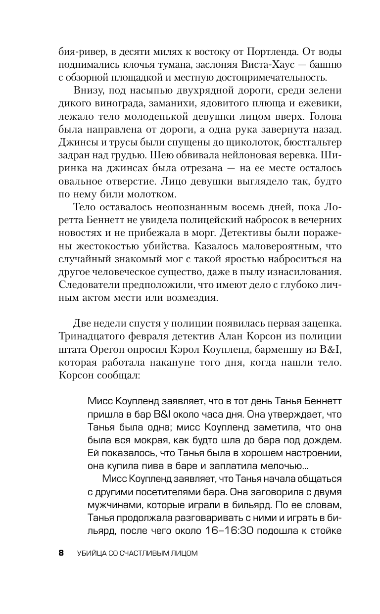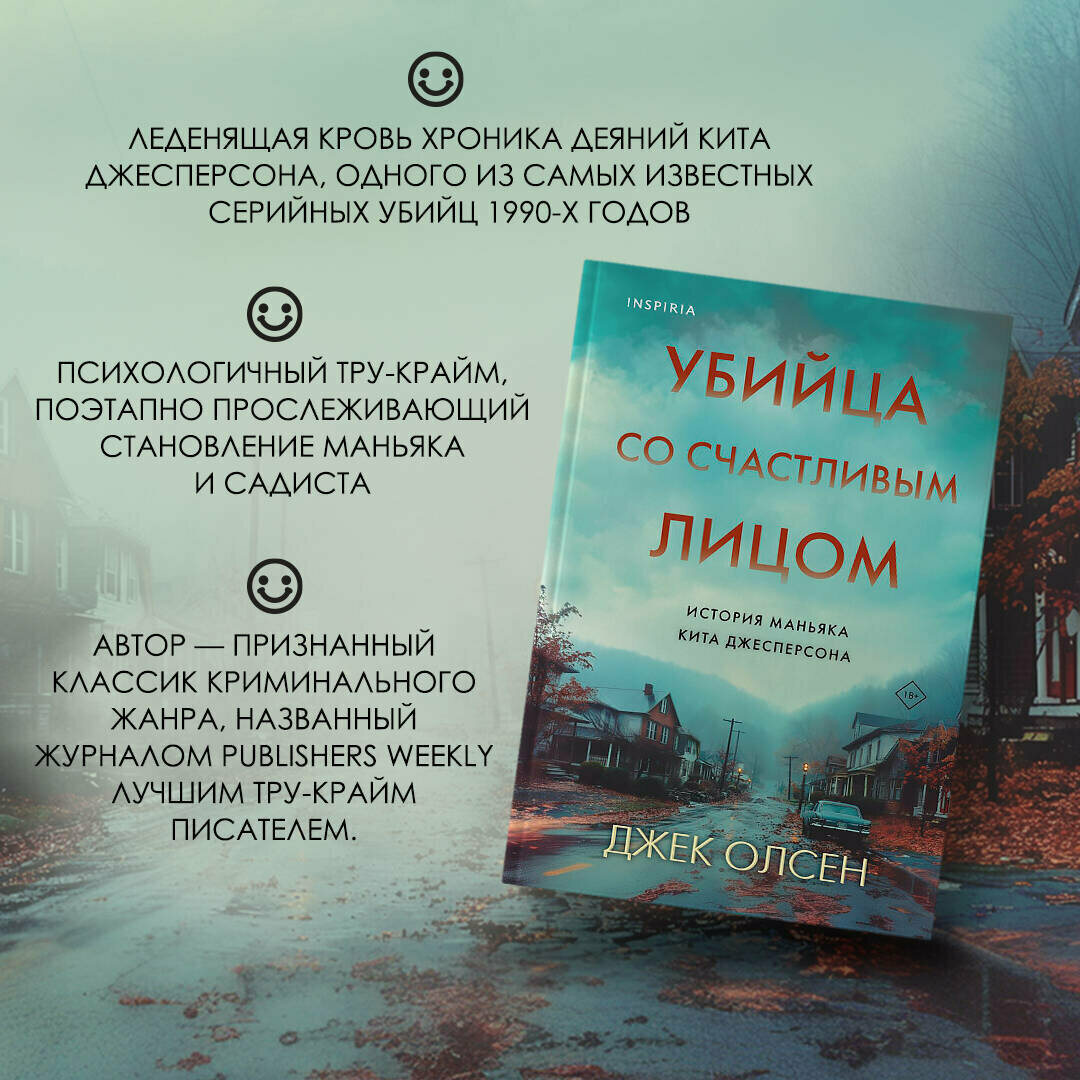В феврале 1990 года полиция штата Орегон арестовала пару Джона Сосновки и Лаверн Павлинак за изнасилование и убийство 23-летней Таньи Беннет. На суде Лаверн обвинила в убийстве Джона, признавшись в соучастии. Власти закрыли дело. Была только одна проблема: за решетку сели невиновные люди… Настоящим убийцей Таньи и семи других девушек был дальнобойщик Кит Джесперсон. Подбирая жертв на трассах, с каждой он играл в "смертельную игру", в которой душил их, затем несколько раз оживлял, прежде чем убить. В извращенной манере маньяка, жаждущего славы, он начал кампанию за освобождение Сосновки и Павлинак. Джесперсон отправлял в редакции газет насмешливые признания в убийствах, пририсовывая смайлик в конце сообщений — за что получил прозвище Убийца со счастливым лицом. Основанная на многочисленных интервью с Джесперсоном и его окружением, дневниках и судебных протоколах, книга "Убийца со счастливым лицом" — это пугающая история становления садиста, рассказанная им самим. Лауреат премии "Эдгар" тру-крайм писатель Джек Олсен позволяет Киту самому поведать свою историю, погружая читателей в сознание маньяка.