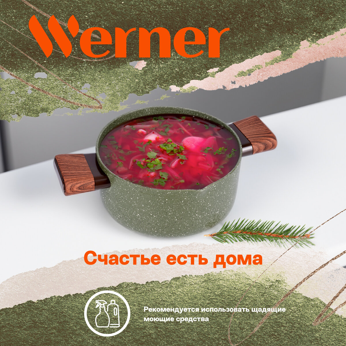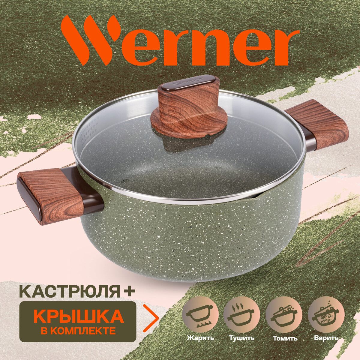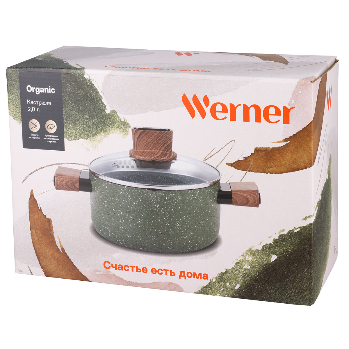 Серия Organic – это сочетание стиля и практичности. Уникальная особенность коллекции – это возможность собрать набор посуды для приготовления, которые будут гармонично дополнять друг друга. Кастрюля Werner Organic Forest style изготовлена из прессованного алюминия, что позволяет ей быстро и равномерно нагреваться. Кастрюля с 2-слойным антипригарным мраморным покрытием исключает пригорание, имеет длительный срок службы, обладает отличной износостойкостью и устойчивостью к царапинам. Ручки изготовлены из бакелита с декором под дерево, с покрытием Soft Touch – термостойкого пластика, который не нагревается и не скользит в руке. Кастрюля имеет носик для слива жидкости. Коллекция Werner Organic выполнена в натуральных природных тонах. Кастрюля цвета зеленой травы с вкраплениями трех оттенков, напоминающим лесной покров. Органично впишется в любой интерьер. Это идеальный вариант для ежедневного применения.