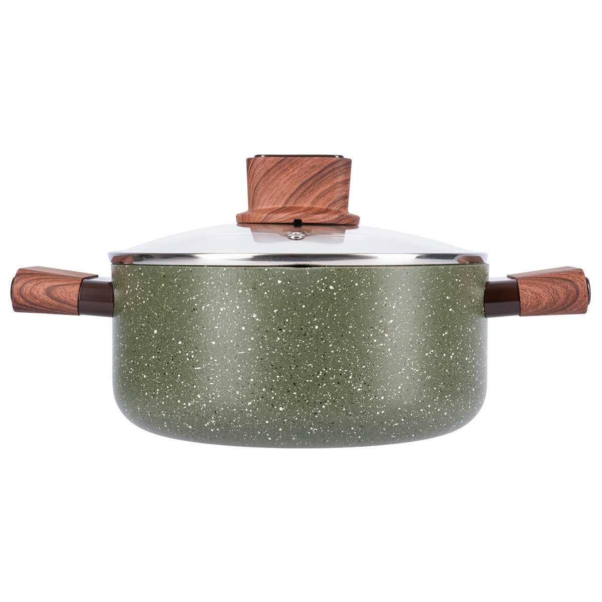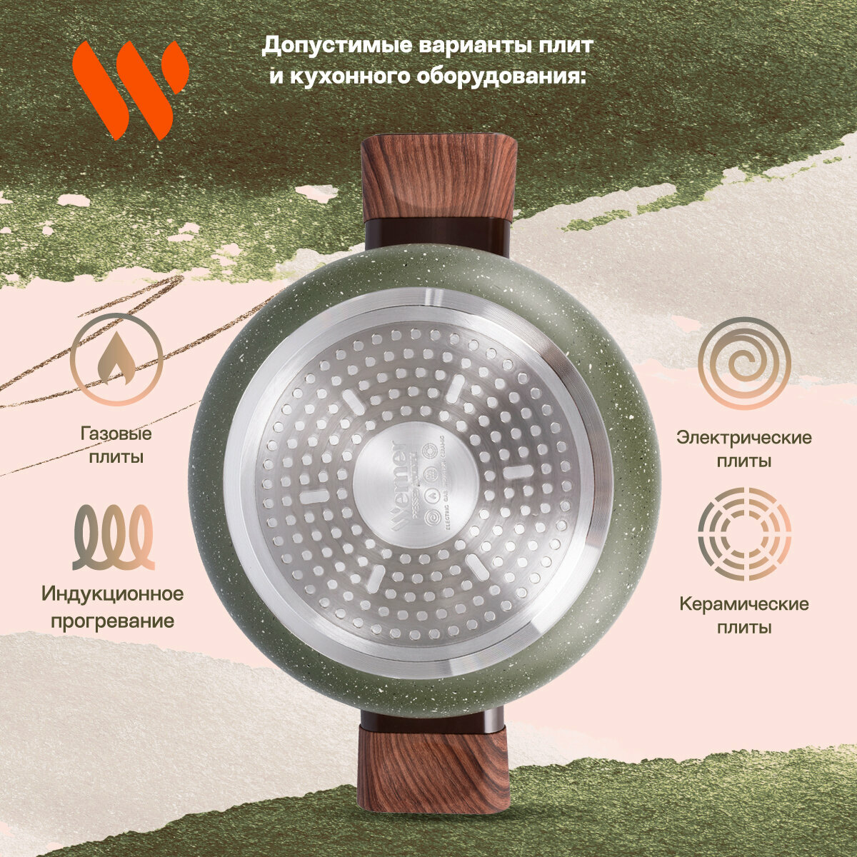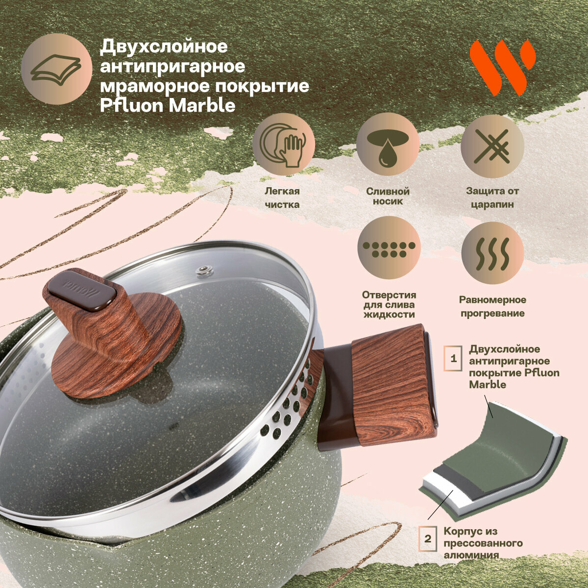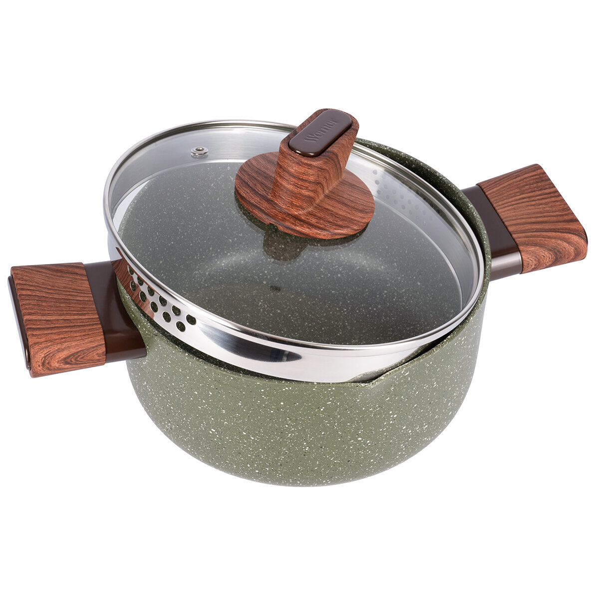 Серия Organic – это сочетание стиля и практичности. Уникальная особенность коллекции – это возможность собрать набор посуды для приготовления, которые будут гармонично дополнять друг друга. Кастрюля Werner Organic Forest style изготовлена из прессованного алюминия, что позволяет ей быстро и равномерно нагреваться. Кастрюля с 2-слойным антипригарным мраморным покрытием исключает пригорание, имеет длительный срок службы, обладает отличной износостойкостью и устойчивостью к царапинам. Ручки изготовлены из бакелита с декором под дерево, с покрытием Soft Touch – термостойкого пластика, который не нагревается и не скользит в руке. Кастрюля имеет носик для слива жидкости. Коллекция Werner Organic выполнена в натуральных природных тонах. Кастрюля цвета зеленой травы с вкраплениями трех оттенков, напоминающим лесной покров. Органично впишется в любой интерьер. Это идеальный вариант для ежедневного применения.