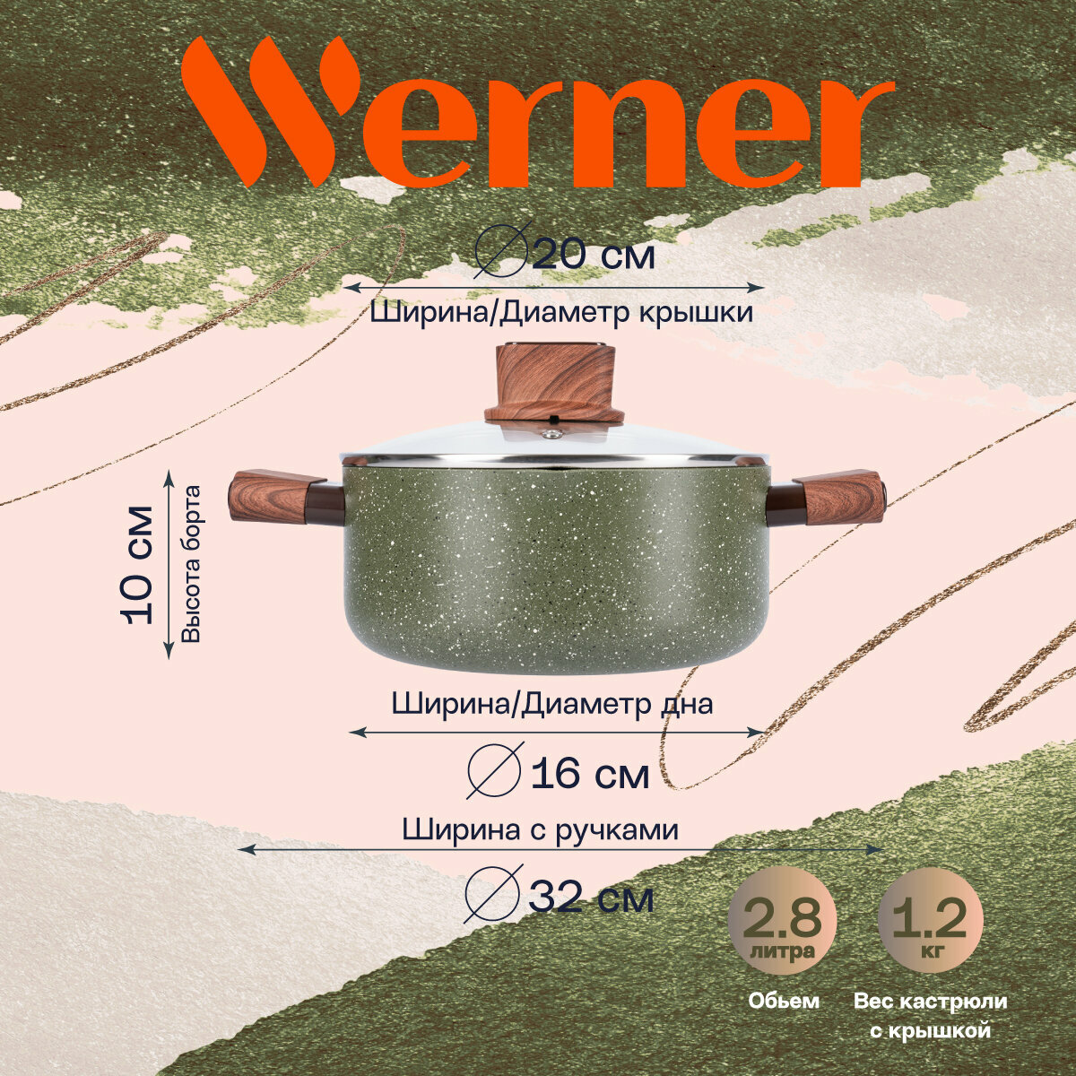 Кастрюля алюминий антипригарное покрытие 3.5 л с крышкой крышка стекло круглая Werner Organic Forest Style 51458 индукция