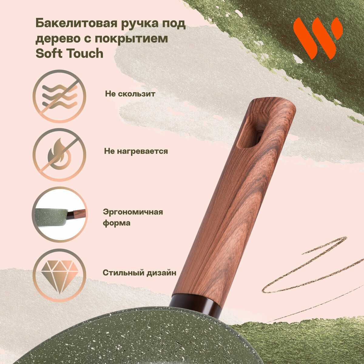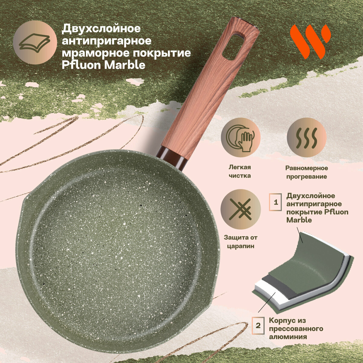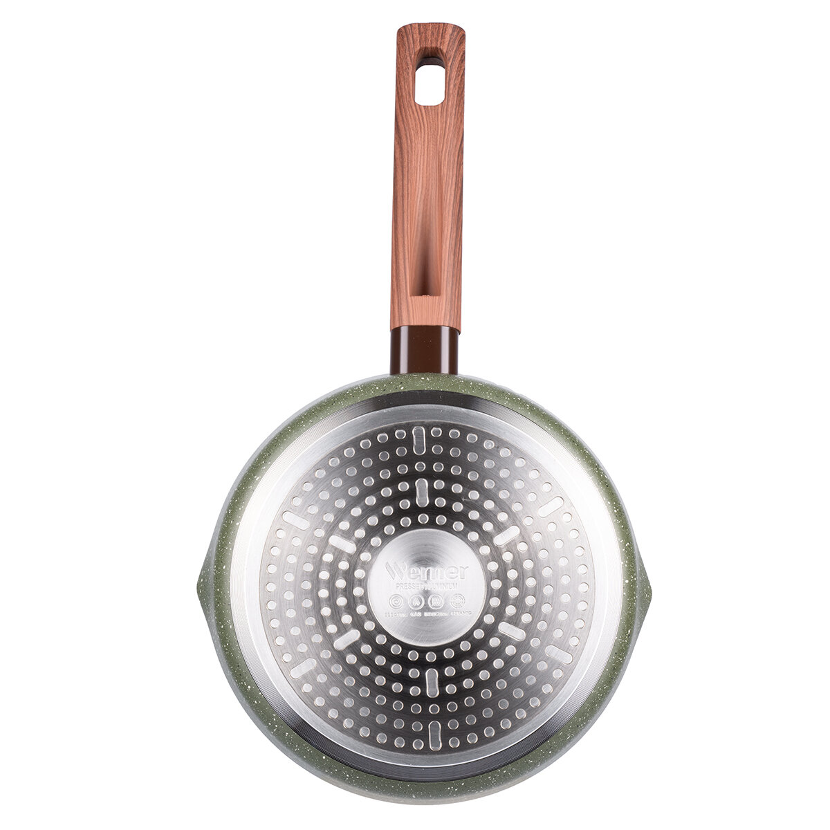 Серия Organic – это сочетание стиля и практичности. Уникальная особенность коллекции – это возможность собрать набор посуды для приготовления, которые будут гармонично дополнять друг друга. Сковорода Werner Organic Forest style изготовлена из прессованного алюминия, что позволяет ей быстро и равномерно нагреваться. Сковорода с 2-слойным антипригарным мраморным покрытием исключает пригорание, имеет длительный срок службы, обладает отличной износостойкостью и устойчивостью к царапинам. Ручка изготовлена из бакелита с декором под дерево, с покрытием Soft Touch – термостойкого пластика, который не нагревается и не скользит в руке. Сковорода имеет носик для слива жидкости. Коллекция Werner Organic выполнена в натуральных природных тонах. Сковорода в зеленом цвете травы с вкраплениями трех оттенков, напоминающим лесной покров. Органично впишется в любой интерьер.