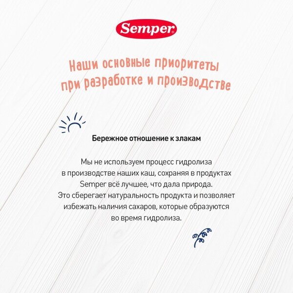 Каши Semper не содержат добавленного сахара и обладают сладостью натурального вкуса молока, злаков, фруктов и ягод, что, в свою очередь, помогает с самого раннего детства формировать привычку к правильному питанию