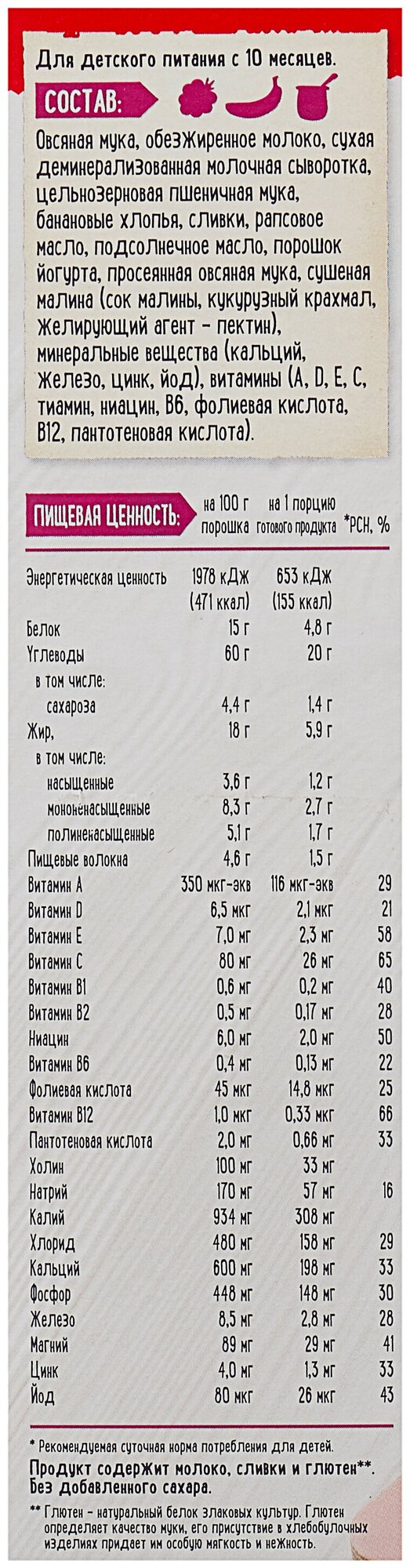 | Состав | цельнозерновая овсяная мука; пшеничная мука; сухое обезжиренное молоко; цельное сухое молоко; сухая деминерализованная молочная сыворотка; банановые хлопья; растительные масла (подсолнечное масло; низкоэруковое рапсовое масло); йогуртовый порошок; малиновые хлопья |