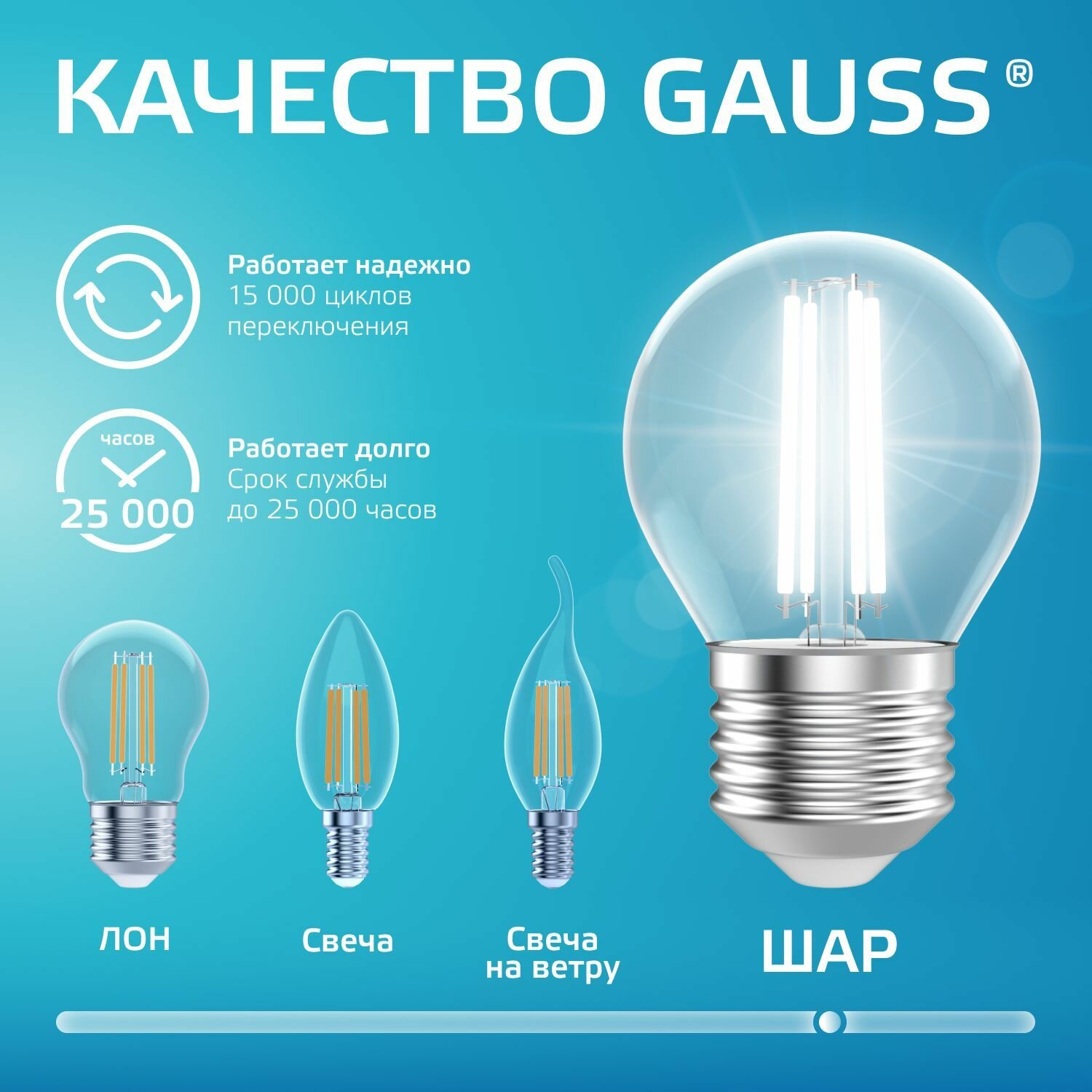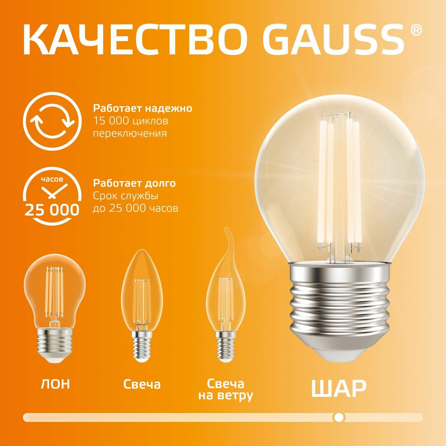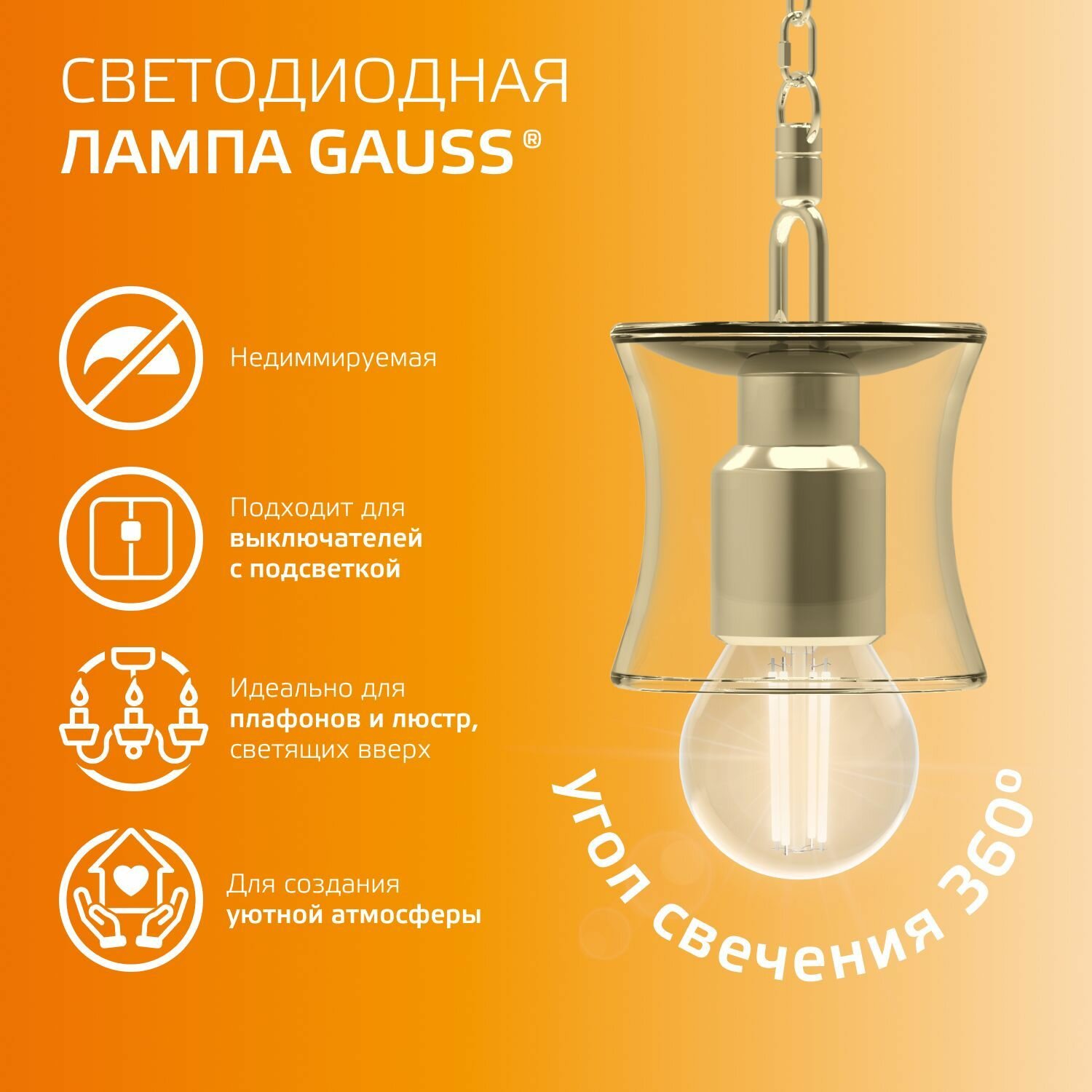 Светодиодные филаментные лампы ''Gauss'' - это новейшие технологии в светотехнике. Лампы имеют привычный вид классических ламп накаливания, освещают пространство на 360° и дают больше света по сравнению с обычными светодиодными лампами за счет прозрачной колбы. Подходят для хрустальных люстр и открытых светильников, а также для реализации дизайнерских решений, где важен вид классических ламп накаливания.