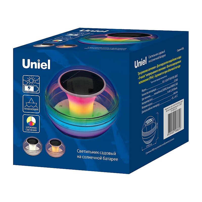 **Светильник садовый плавающий Uniel «Pool Light»** предназначен для декоративной подсветки водоемов и сада, имеет 3 режима свечения: RGB, теплый белый, белый, который выбирается выключателем.