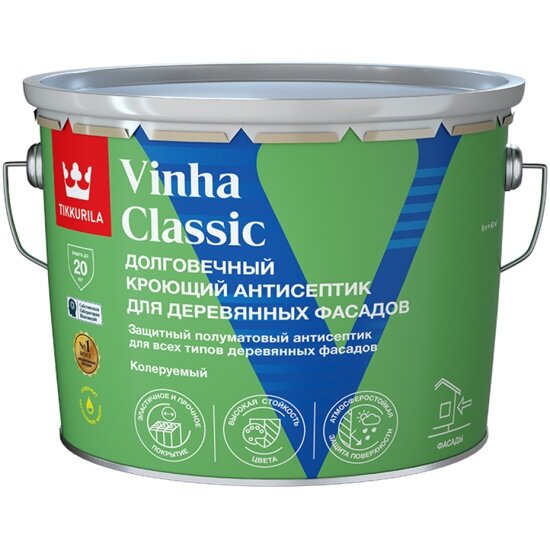 **Антисептик кроющий Tikkurila Vinha Classic** предназначен для окраски новых или обработанных ранее кроющей защитой Tikkurila Vinha Classic или лессирующими материалами наружных деревянных поверхностей, пиленых, строганных, бревенчатых поверхностей, а также термообработанной и пропитанной под давлением древесины. Подходит также для загрунтованных промышленным способом деревянных поверхностей. Применяется для обработки наружных стен и других подобных поверхностей.
