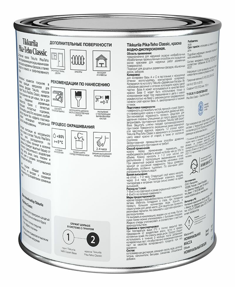**Краска фасадная Tikkurila Pika-Teho Classic** предназначена для наружной окраски необработанных, обработанных промышленным способом или окрашенных ранее красками для наружных работ деревянных поверхностей. Применяется для окраски дощатых наружных стен, включая деревянные панели, блокхаус, планкен и вагонку, обшивочных досок, заборов, беседок, навесов и других подобных поверхностей.