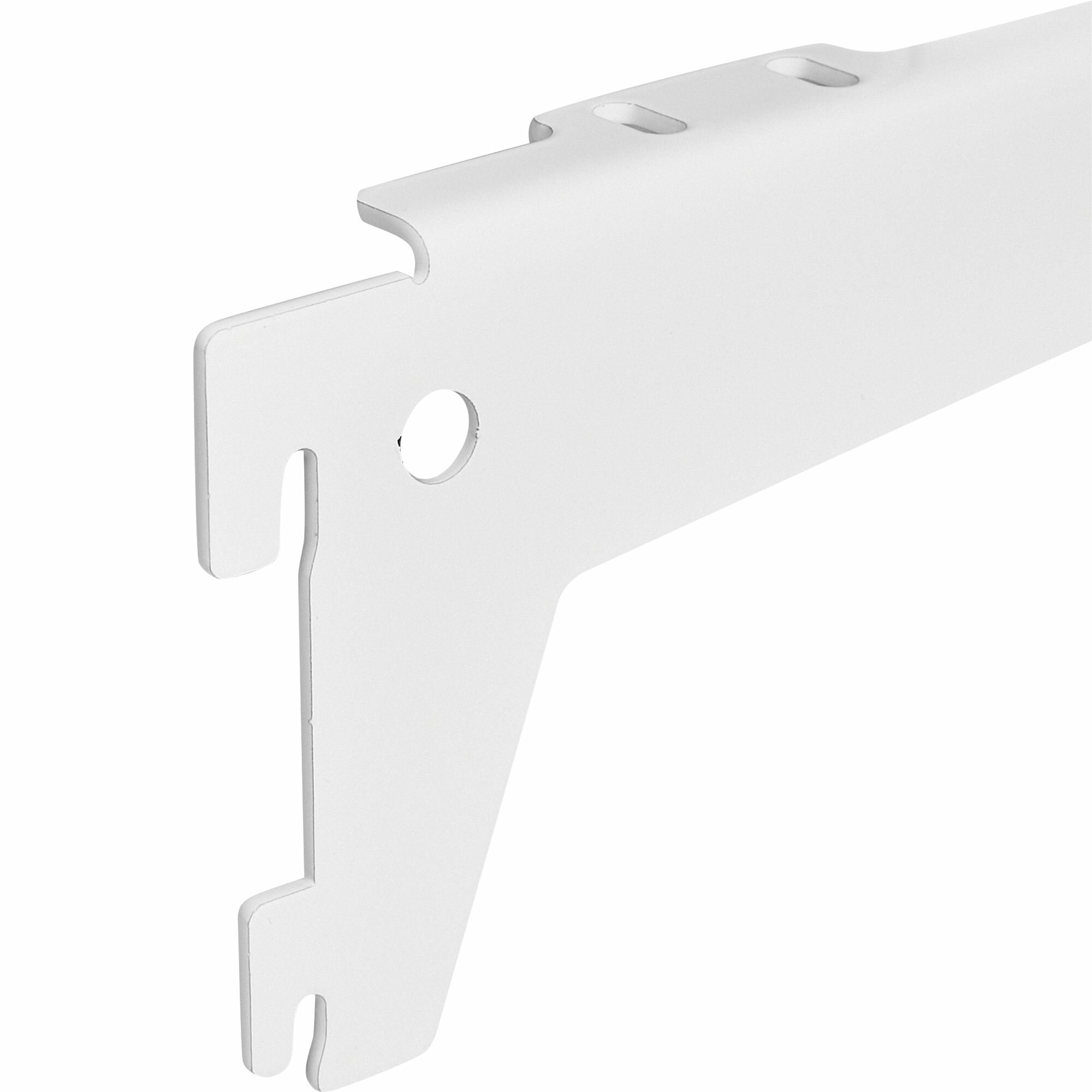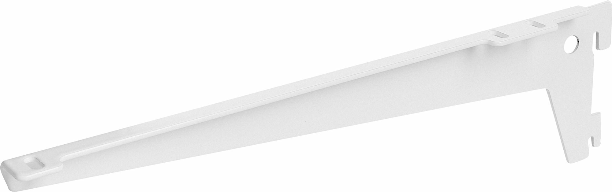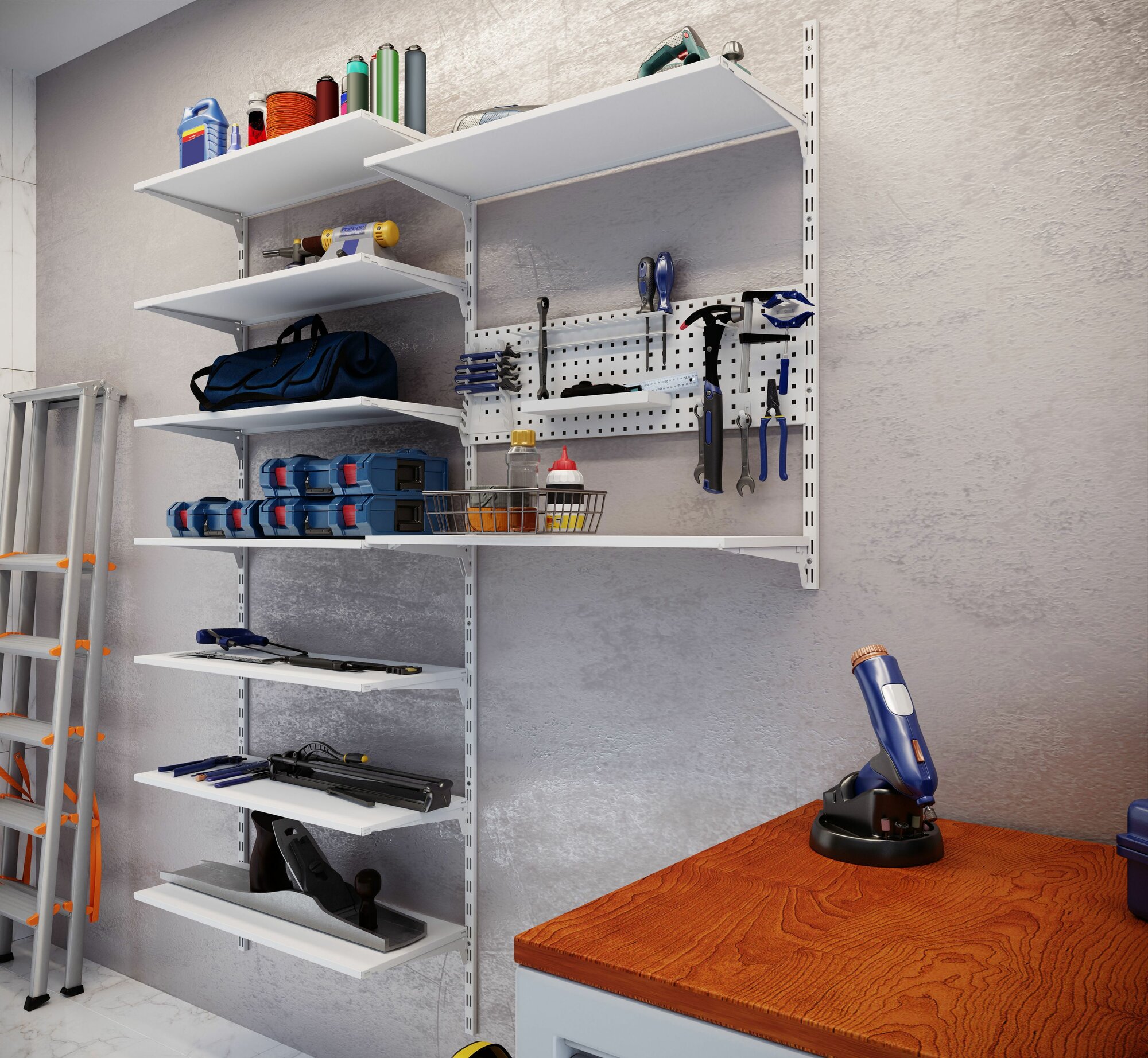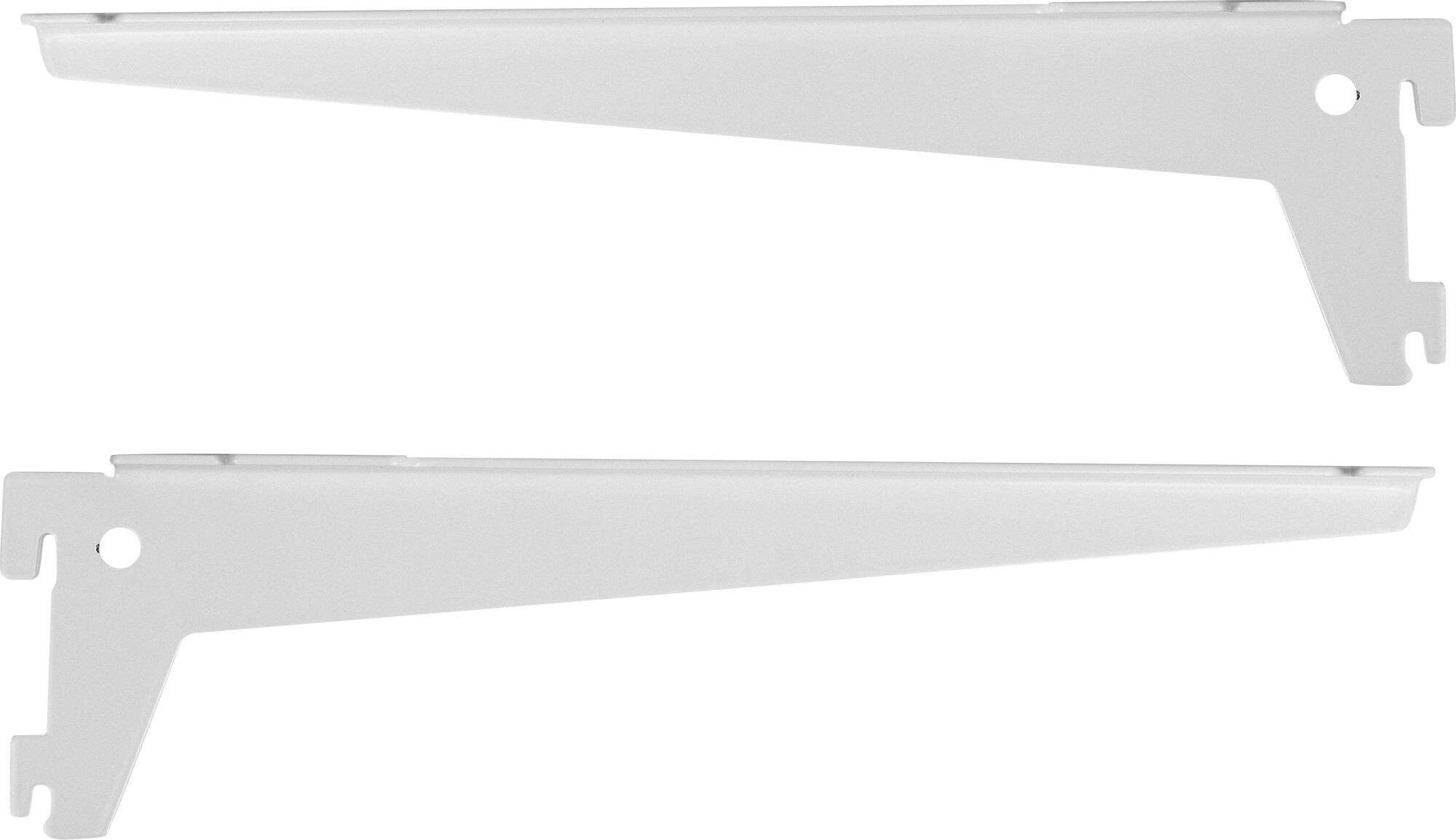 Система предназначена для того, чтобы навести порядок в мастерской, гараже или на складе. В комплект входят 2 одинарных стальных кронштейна белого цвета. Каждый может выдержать нагрузку до 50 кг. Его конструкция позволяет сочетать кронштейн с одинарной стойкой и полками, чтобы получилась комбинация для хранения.