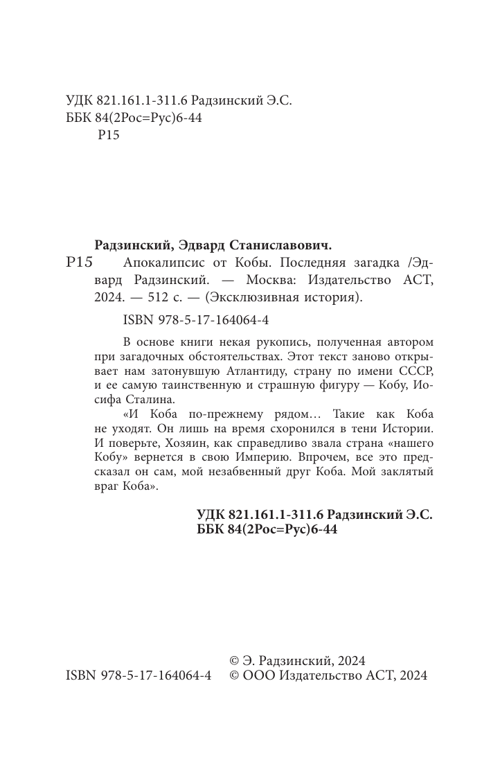 Апокалипсис от Кобы. Иосиф Сталин. Последняя загадка (Эдвард Станиславович Радзинский); АСТ, 2024