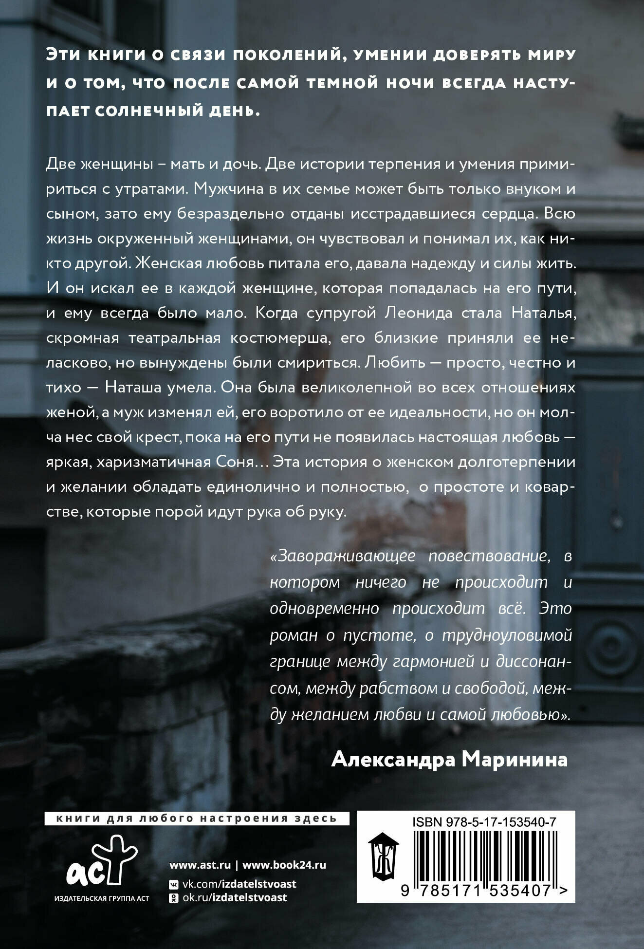 Две женщины – мать и дочь. Две истории терпения и умения примириться с утратами. Мужчина в их семье может быть только внуком и сыном, зато ему безраздельно отданы исстрадавшиеся сердца. Всю жизнь окруженный женщинами, Леонид чувствовал и понимал их, как никто другой. Женская любовь питала его, давала надежду и силы жить. И он искал ее в каждой женщине, которая попадалась на его пути, и ему всегда было мало. Когда супругой Лени стала Наталья, скромная театральная костюмерша, его близкие приняли ее неласково, но вынуждены были смириться. Наташа была великолепной во всех отношениях женой, а муж изменял ей, его воротило от ее идеальности, но он молча нес свой крест, пока на его пути не появилась яркая, харизматичная Соня… Эта история о женском долготерпении и желании обладать единолично и полностью, простоте и коварстве, которые порой идут рука об руку.