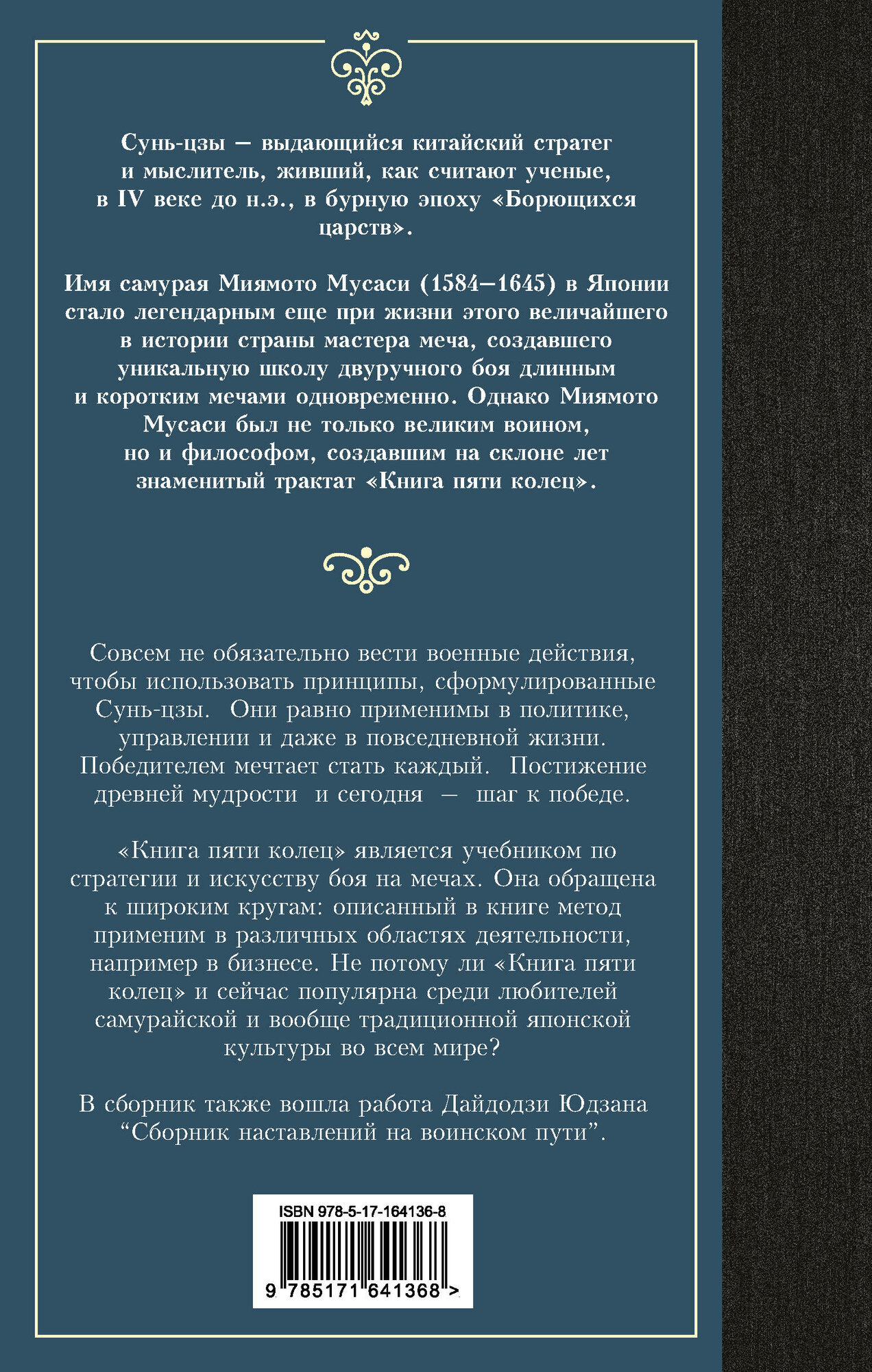 Тот, кто знает, когда можно сражаться, а когда нельзя, одержит победу. Тот, кто понимает, как использовать большие и малые силы, одержит победу. Тот, у кого верхи и низы горят одним и тем же желанием, одержит победу. Тот, кто, будучи полностью готов, ждет неподготовленного, одержит победу. Совсем не обязательно вести военные действия, чтобы использовать принципы, сформулированные Сунь-цзы. Они равно применимы в политике, управлении и даже в повседневной жизни. Победителем мечтает стать каждый. Постижение древней мудрости и сегодня – шаг к победе. Свиток Земли, Свиток Воды, Свиток Огня, Свиток Ветра и Свиток Пустоты — так, с чисто японской поэтичностью, называются различные разделы этого удивительного произведения, написанного человеком, для которого война и философия были неотделимы друг от друга, как то могло быть лишь для истинного самурая. «Книга пяти колец» является учебником по стратегии и искусству боя на мечах. Она обращена к широким кругам: описанный в книге метод применим в различных областях деятельности, например в бизнесе. Не потому ли «Книга пяти колец» и сейчас популярна среди любителей самурайской и вообще традиционной японской культуры во всем мире? В сборник также вошла работа Дайдодзи Юдзана "Сборник наставлений на воинском пути".