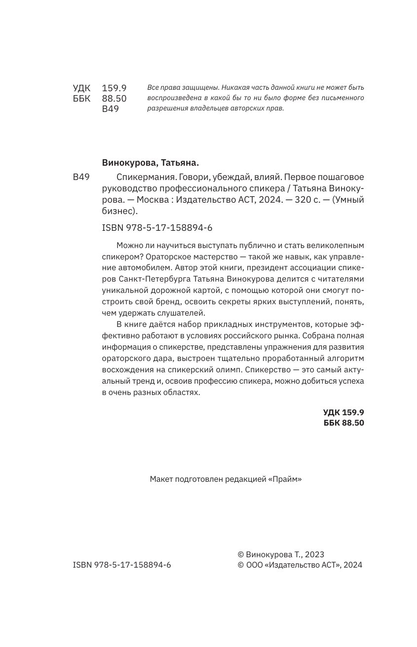 Можно ли научиться выступать публично и стать великолепным спикером? Ораторское мастерство — такой же навык, как управление автомобилем. Автор этой книги, президент ассоциации спикеров Санкт-Петербурга Татьяна Винокурова делится с читателями уникальной дорожной картой, с помощью которой они смогут построить свой бренд, освоить секреты ярких выступлений, понять, чем удержать слушателей. В книге даётся набор прикладных инструментов, которые эффективно работают в условиях российского рынка. Собрана полная информация о спикерстве, представлены упражнения для развития ораторского дара, выстроен тщательно проработанный алгоритм восхождения на спикерский олимп. Спикерство — это самый актуальный тренд и, освоив профессию спикера, можно добиться успеха в очень разных областях.