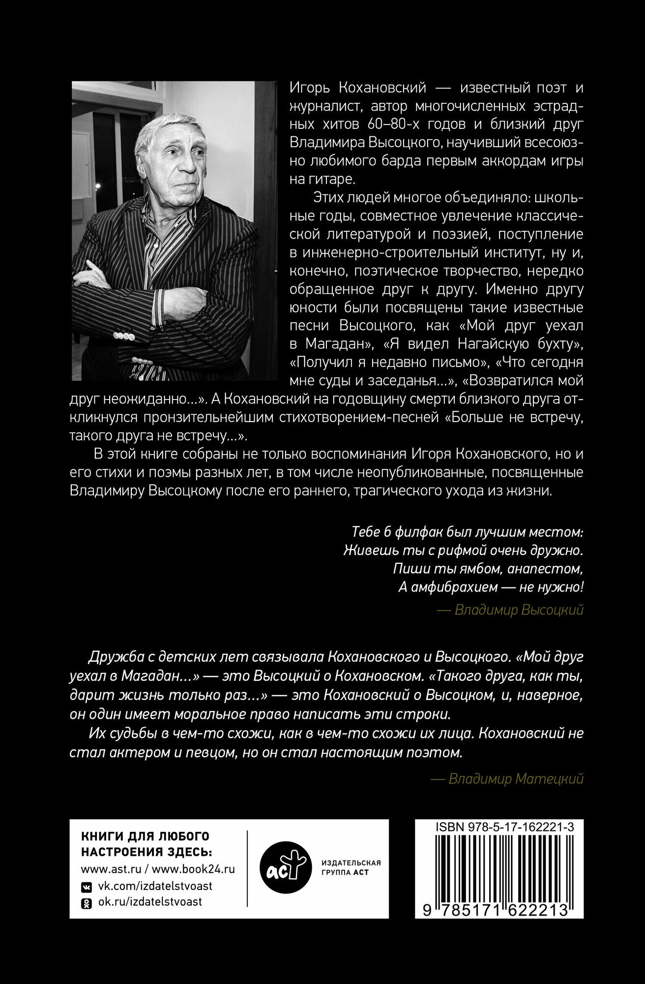 Игорь Кохановский — известный поэт и журналист, автор многочисленных эстрадных хитов 60–80-х годов и близкий друг Владимира Высоцкого, научивший всесоюзно любимого барда первым аккордам игры на гитаре. В этой книге собраны не только воспоминания Игоря Кохановского, но и его стихи и поэмы разных лет, в том числе и неопубликованные, посвященные Владимиру Высоцкому после его раннего, трагического ухода из жизни.