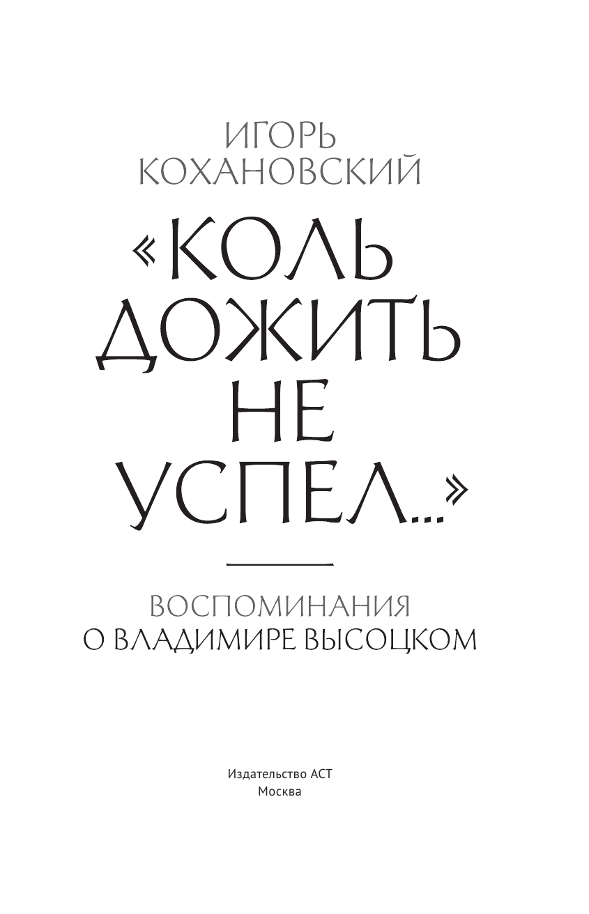 Воспоминания о Владимире Высоцком. "Коль дожить не успел..." (Игорь Кохановский); Издательство АСТ, 2024
