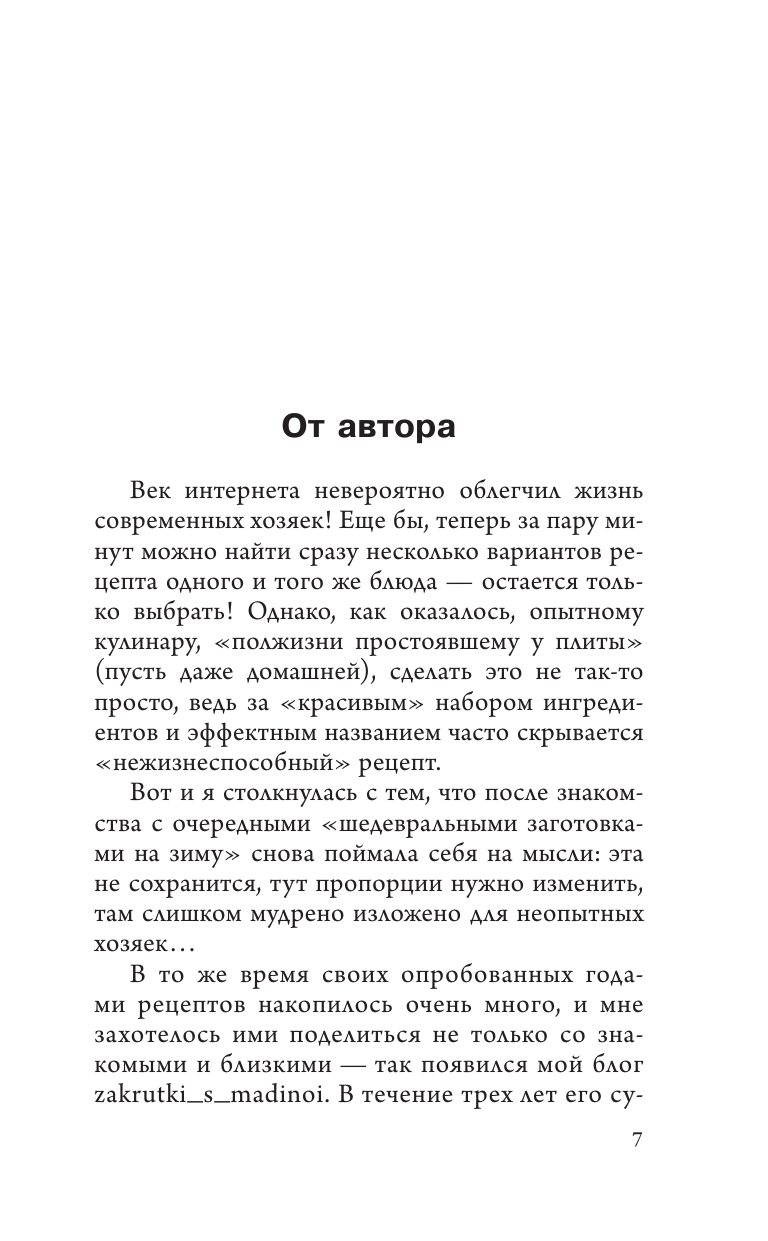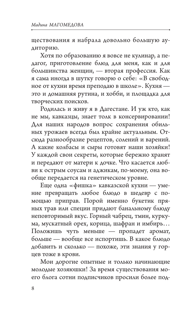 МАДИНА МАГОМЕДОВА, одна из самых известных фуд-блогеров из республики Дагестан, поделится с вами рецептами самых вкусных заготовок летнего урожая. Вы узнаете все о правилах заготовки закруток, научитесь делать самые вкусные соленья, маринады соусы и многое другое. Ведомые чуткой и опытной рукой Мадины, вы не столкнетесь с нежизнеспособными рецептами, неправильными пропорциями и тем более с плохим вкусом! Эта книга состоит только из проверенных фирменных рецептов, при помощи которых получится сохранить уникальный вкус летних овощей. В качестве бонуса — секреты приготовления и долгосрочного хранения удивительно вкусных колбас и сыра.