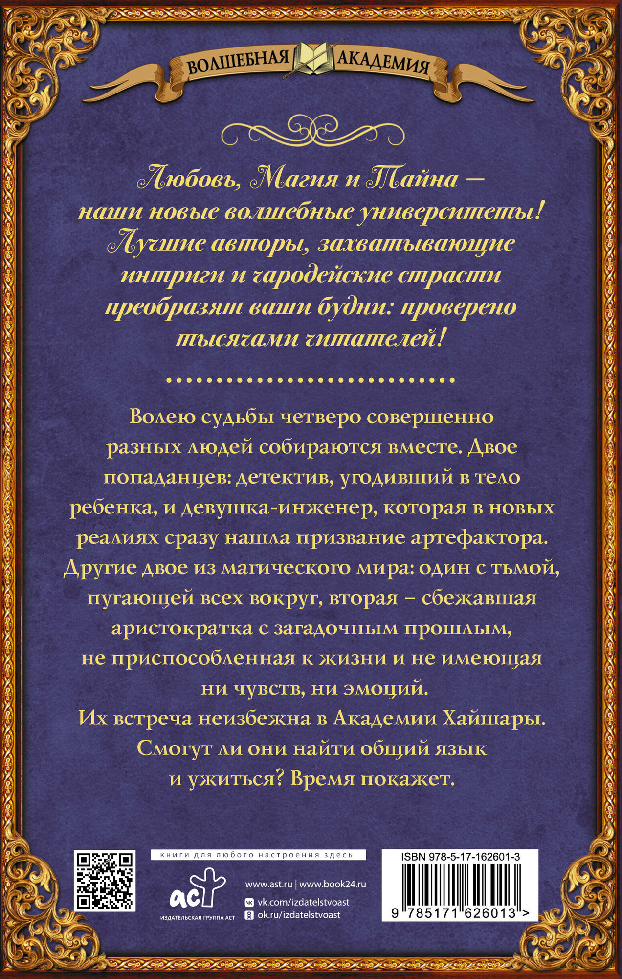 Волею судьбы четверо совершенно разных людей собираются вместе. Двое попаданцев: детектив, угодивший в тело ребенка, и девушка-инженер, которая в новых реалиях сразу нашла призвание артефактора. Другие двое из магического мира: один с тьмой, пугающей всех вокруг, вторая – сбежавшая аристократка с загадочным прошлым, не приспособленная к жизни и не имеющая ни чувств, ни эмоций. Их встреча неизбежна в Академии Хайшары. Смогут ли они найти общий язык и ужиться? Время покажет.