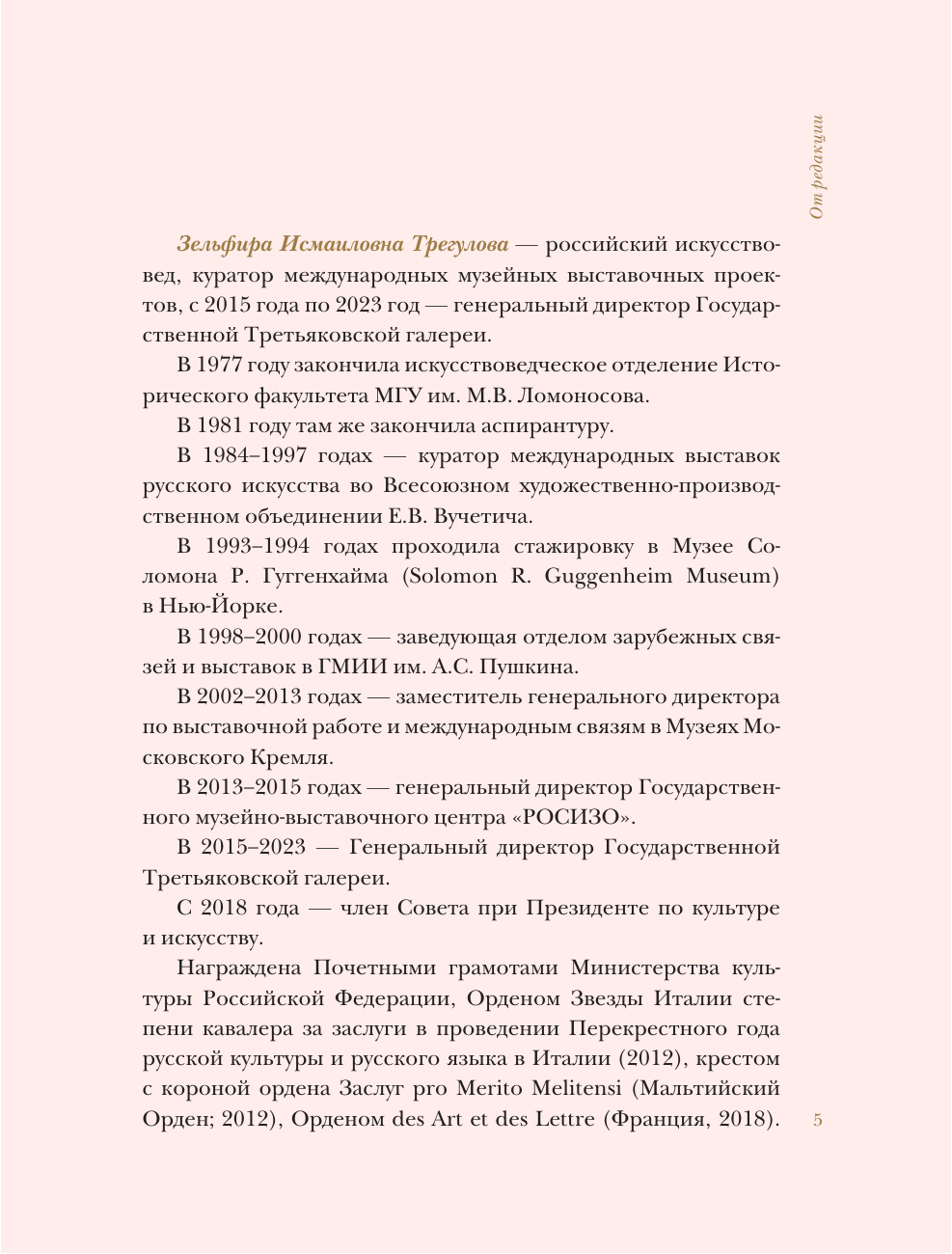 "Шедевры Третьяковки. Личный взгляд" — это увлекательная прогулка по залам Третьяковской галереи вместе с Зельфирой Трегуловой. В книге описываются знаменитые полотна российских художников XIX и XX веков: Ильи Репина, Михаила Врубеля, Казимира Малевича и других.Автор рассказывает о том, какие картины кажутся ей наиболее значимыми для истории мирового искусства и почему.Книга будет интересна читателям, которые хотят по-настоящему оценить сокровища российской живописи и взглянуть на них глазами одного из самых уважаемых кураторов страны.