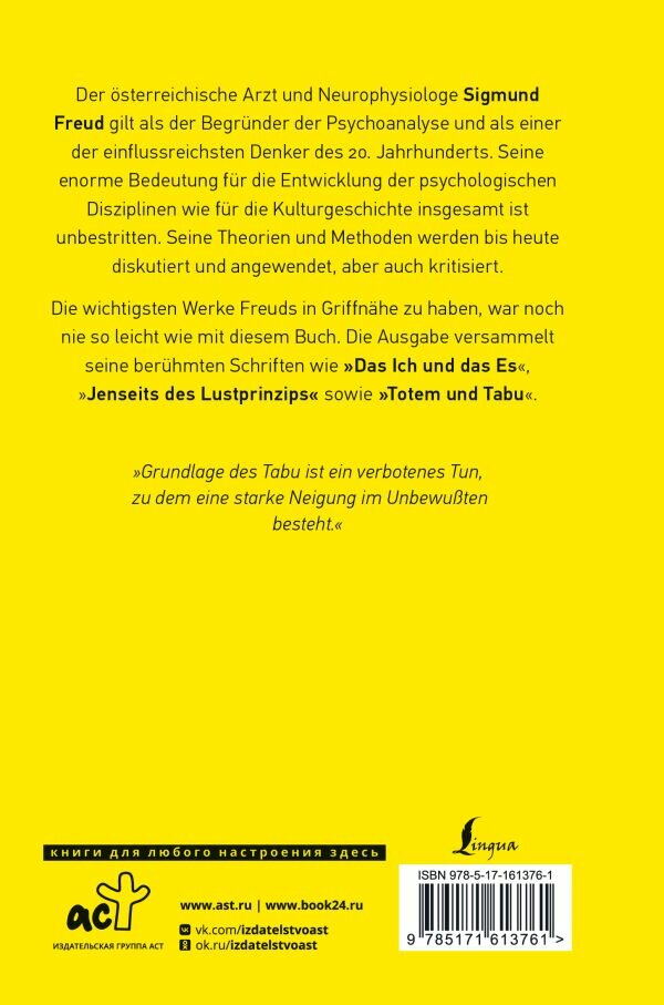Издание на немецком языке.Зигмунд Фрейд – выдающийся австрийский психолог и психиатр, основатель психоанализа, один из самых влиятельных мыслителей XX века. Его работы сформировали основы современной психологии и внесли значительный вклад в понимание человеческого поведения и психических расстройств.В сборник вошли самые важные и увлекательные работы Фрейда – "Тотем и Табу", "По ту сторону принципа удовольствия", "Я и Оно". В этих произведениях автор затрагивает наиболее спорные и значимые темы психоанализа – связь древних культур с морально-этическими нормами современного общества, психологию сексуальности и глубинные механизмы взаимодействия сознательного и бессознательного.Книга издана в неадаптированной версии. Познайте свое внутреннее "я" и насладитесь духовным миром Фрейда в оригинале!