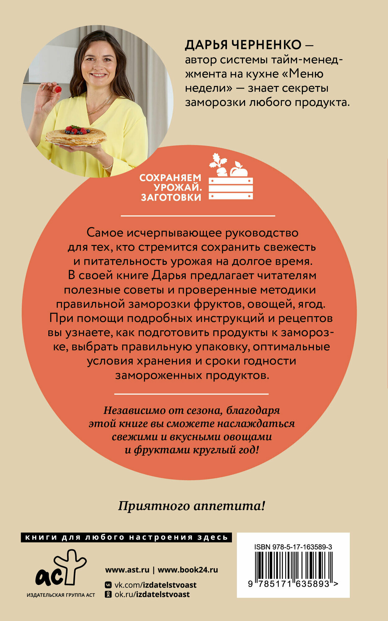 Дарья Черненко — автор системы тайм-менеджмента на кухне «Меню недели» — знает секреты заморозки любого продукта. Самое исчерпывающее руководство для тех, кто стремится сохранить свежесть и питательность урожая на долгое время. В своей книге Дарья делится полезными советами и проверенной методикой правильной заморозке фруктов, овощей, ягод и других продуктов сада и огорода. Через подробные инструкции и рецепты вы узнаете, как подготовить продукты к заморозке, выбрать правильную упаковку, оптимальные условия хранения и сроки годности замороженных продуктов. Кроме того, каждый новый раздел содержит массу полезных ссылок на видео-рецепты. И это не все! В книге Вы найдете набор наклеек для удобной маркировки замороженных продуктов. Независимо от сезона, благодаря этой книге вы сможете наслаждаться свежими и вкусными овощами и фруктами круглый год!