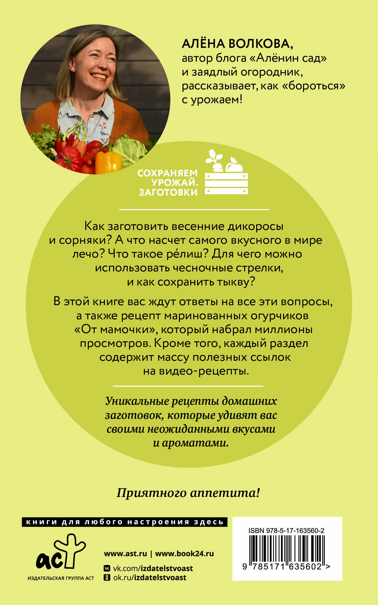АЛЁНА ВОЛКОВА, автор блога “Алёнин сад” и заядлый огородник, рассказывает, как «бороться» с урожаем! Почему в наши дни, когда в супермаркетах — «хранилищах» всевозможных продуктов, — есть все и всегда, некоторые хозяйки ежегодно организуют на своей кухне «маленький консервный заводик»? Ответ прост — потому что домашняя кухня всегда вкуснее, разнообразнее и полезнее. А еще, домашняя заготовка — очень творческое и увлекательное занятие, которое помогает снимать стресс. Как заготовить весенние дикоросы и сорняки? А что насчет самого вкусного в мире лечо? Что такое ре́лиш? Для чего можно использовать чесночные стрелки, и как сохранить тыкву? В этой книге вас ждут ответы на все эти вопросы, а также рецепт маринованных огурчиков «От мамочки», который набрал миллионы просмотров. Кроме того, каждый новый раздел содержит массу полезных ссылок на видео-рецепты. И это не все! В книге Вы найдете набор наклеек для удобной маркировки заготовок.