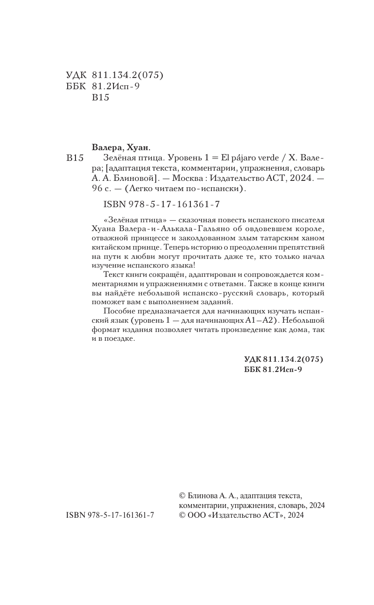 Зелёная птица. Уровень 1 = El pajaro verde (Хуан Валера); Издательство АСТ, 2024