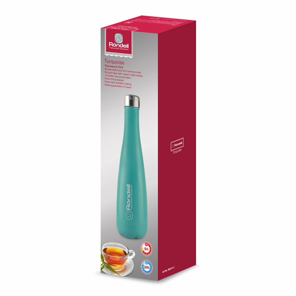 Rondell RDS-912 – оригинальный термос с прочным стальным корпусом в виде бутылки, предназначенный для напитков. В холодную погоду в нём можно носить с собой горячий чай или кофе, а в жару – прохладную воду либо сок.