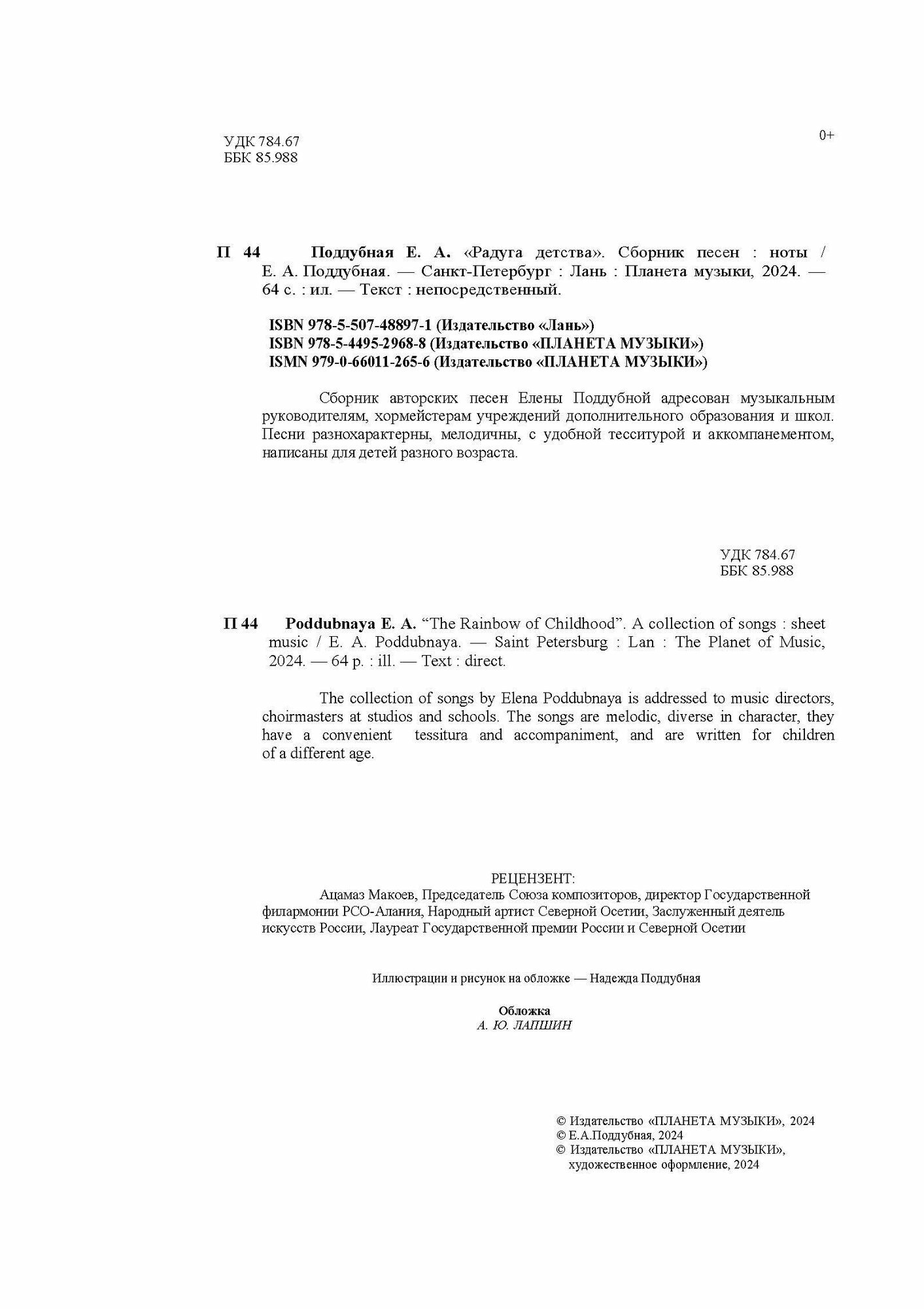 Радуга детства. Сборник песен. Ноты (Елена Поддубная); Издательство «Планета музыки», 2024