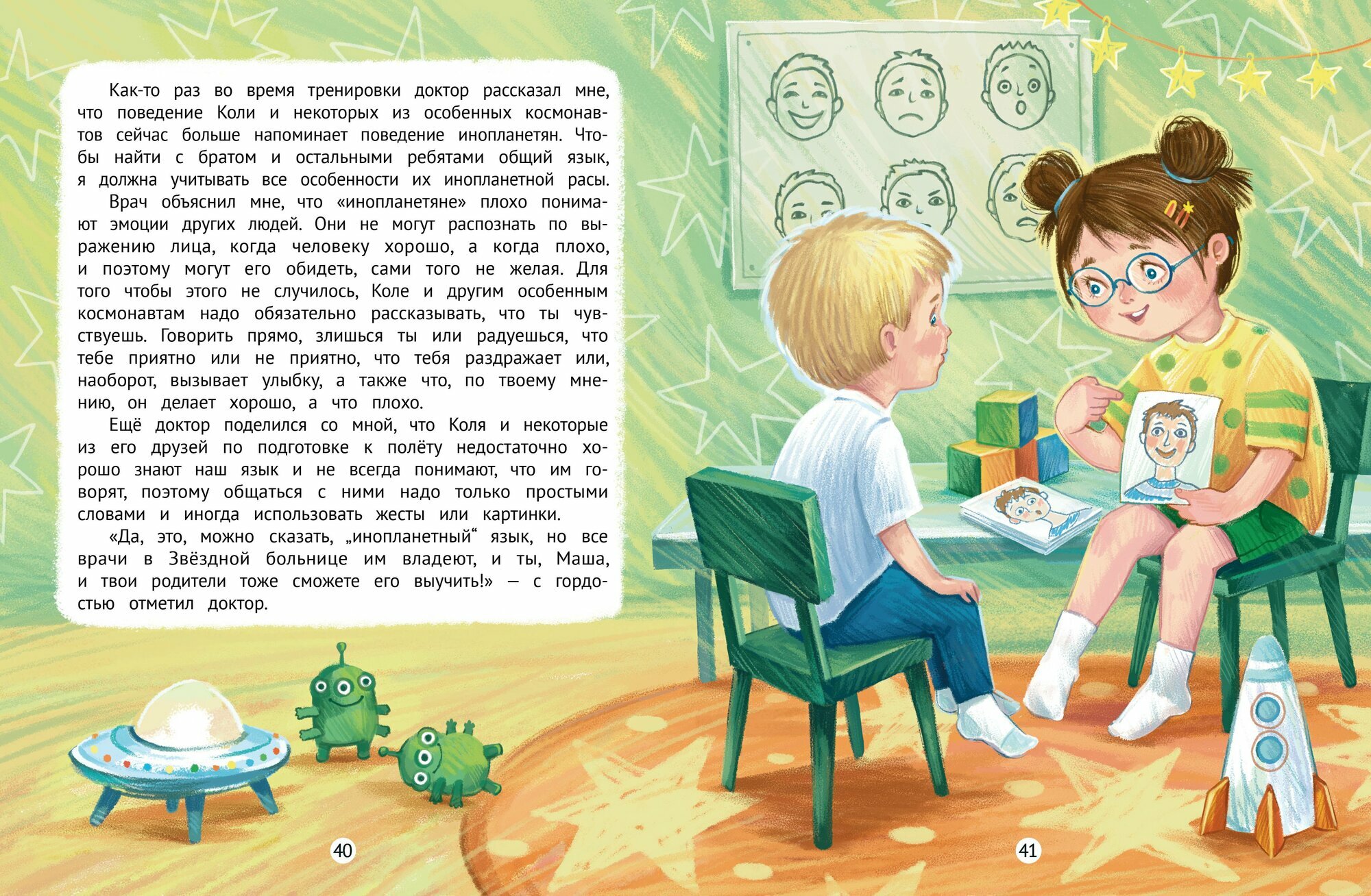 В семье маленькой Маши пополнение: Маша рада, теперь у нее есть братик! Только ведет он себя не совсем обычно. Поскольку Машина семья живет в небольшом городке у космодрома, родители объясняют дочке необычное поведение малыша, используя образы космонавтов и подготовки к космическим полетам. Там, в космосе, все не так, как мы привыкли на Земле, поэтому и поведение может быть отличающимся. Понятные детям образы помогут объяснить ребенку, что существуют нормотипичные люди и те, кто отличается, например, люди с расстройством аутического спектра (РАС). Эта поддерживающая и бережная история была придумана Максимом Пискуновым - детским психиатром высшей категории. В конце книги содержится список признаков, на которые стоит обратить внимание, если есть подозрение на РАС.
