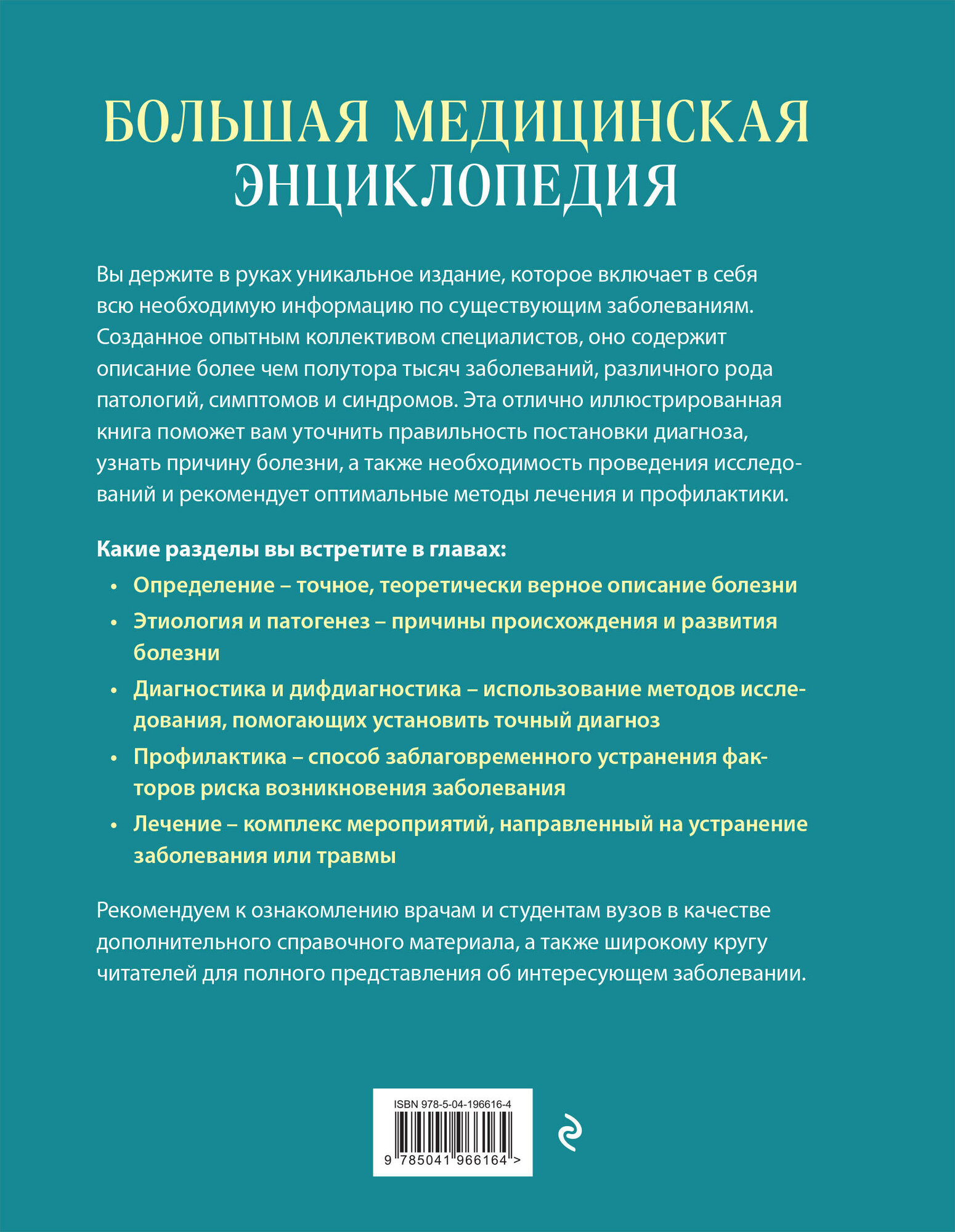 Данная книга является дополненным и актуализированным изданием Большой медицинской энциклопедии, проданной в количестве более 1 000 000 экземпляров. На страницах книги вы найдете подробную характеристику заболеваний с наглядными иллюстрациями. Удобная постраничная навигация от А до Я поможет быстро сориентироваться в содержании, также в конце есть словник с определениями каждого медицинского термина. Незаменимая книга для всех, кто стремится пополнить свои знания и кто ценит свое здоровье.