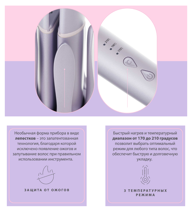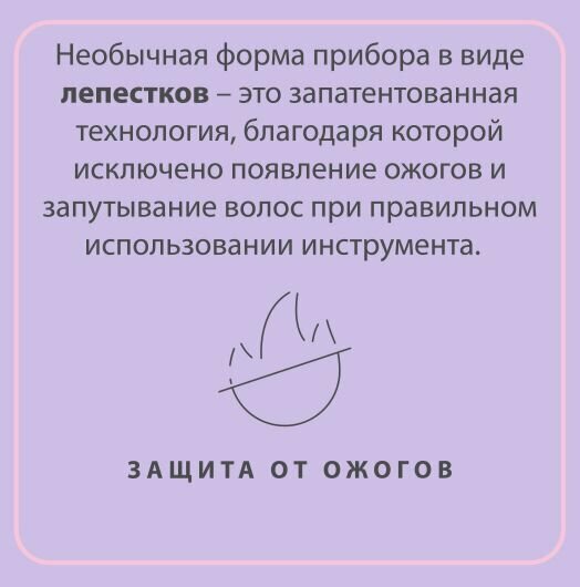 Необычная форма прибора в виде лепестков – это запатентованная технология, благодаря которой исключено появление ожогов и запутывание волос при правильном использовании инструмента.