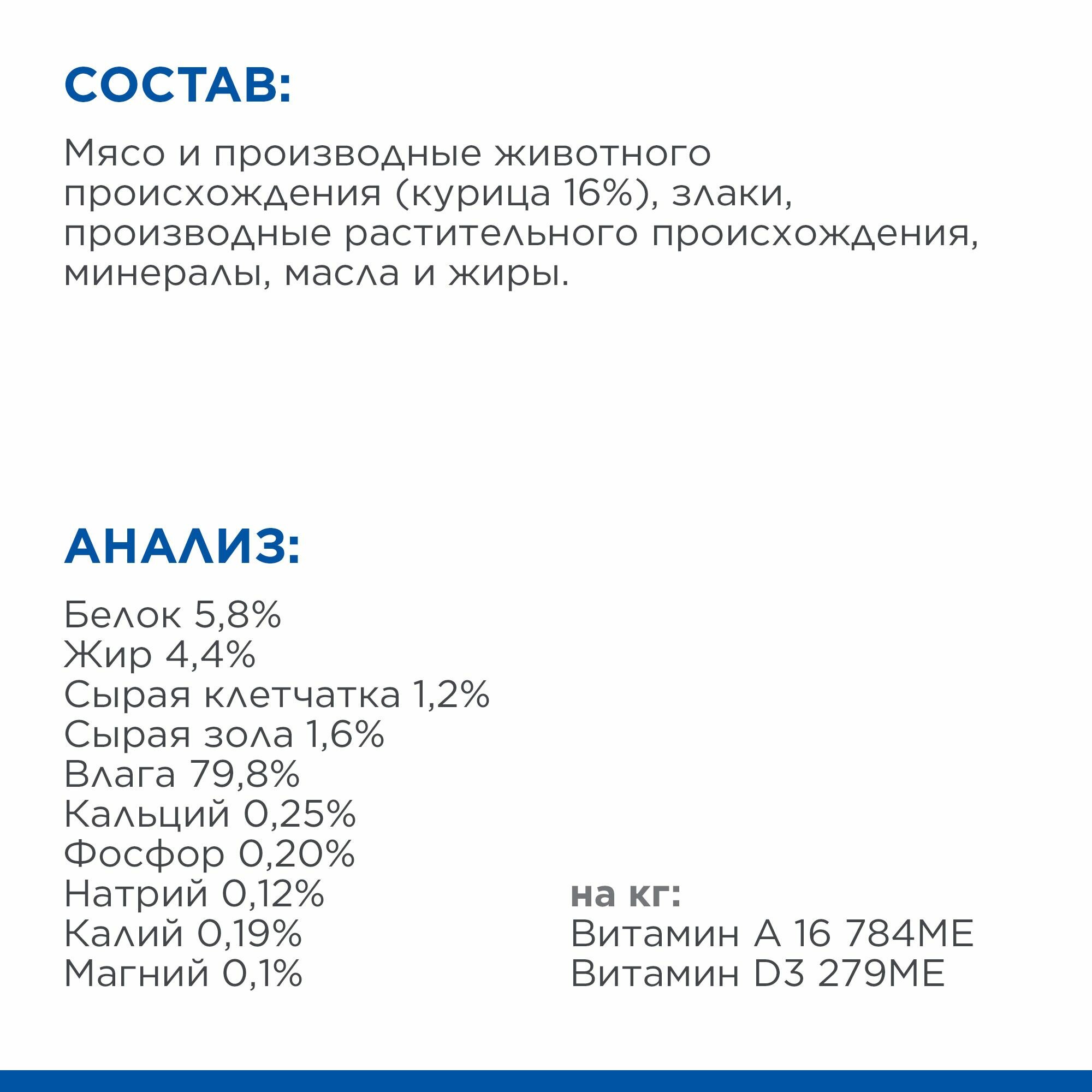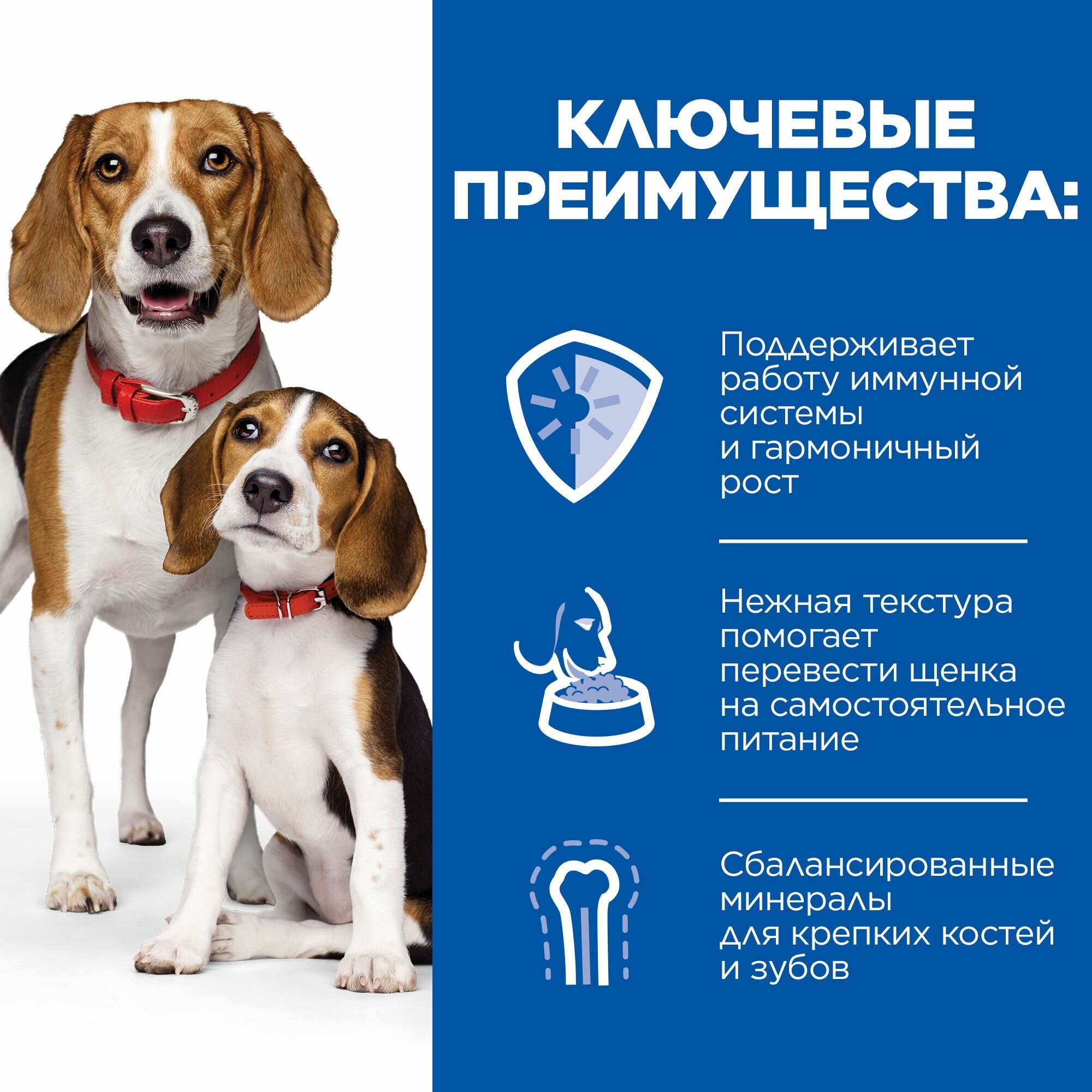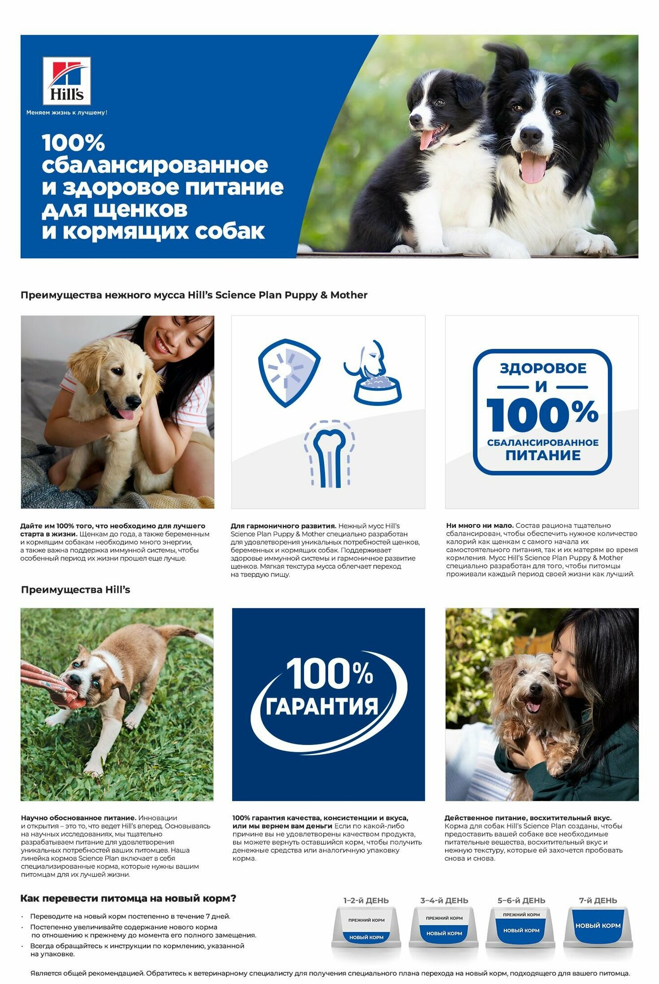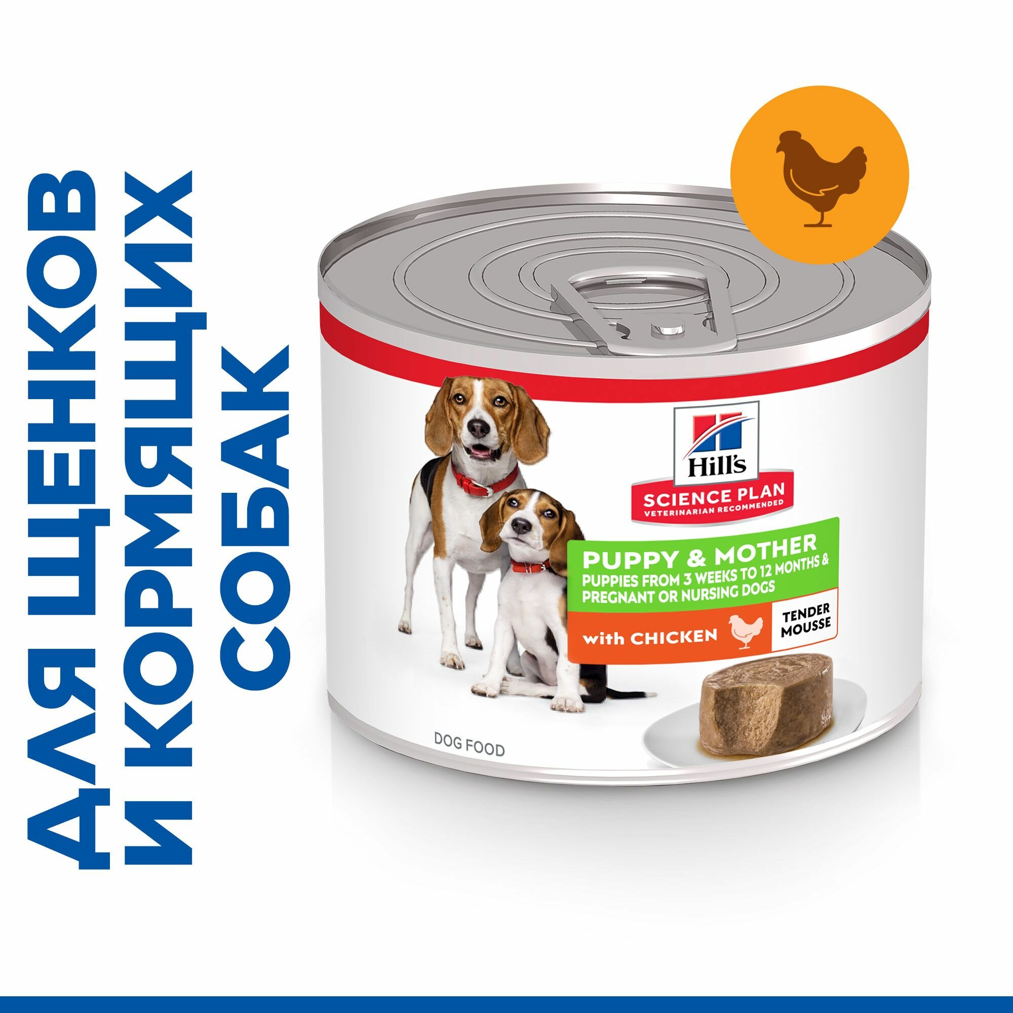 Влажный корм Hill's Science Plan Puppy & Mother Нежный Мусс с Курицей - это полноценное и 100% сбалансированное питание для щенков и беременных или кормящих собак. Данный рацион разработан таким образом, чтобы обеспечить необходимое количество энергии для щенков на первом этапе их жизни и для матерей в период лактации. В ассортименте Hill's Science Plan представлены сухие и влажные рационы для собак, с большим разнообразием восхитительных вкусов, которые точно понравятся вашему лучшему другу. - Hill's Science Plan Puppy & Mother Нежный Мусс с Курицей обеспечивает поддержку иммунной системы и способствует здоровому росту. - Вкусная, мягкая и нежная текстура мусса облегчает переход к твердой пище, а добавленные минералы поддерживают развитие крепких костей и зубов. - 100% сбалансированный рацион обеспечивает необходимое количество энергии, содержит ДГК для здорового развития мозга и глаз щенков, а также клетчатку для здоровья кишечника.