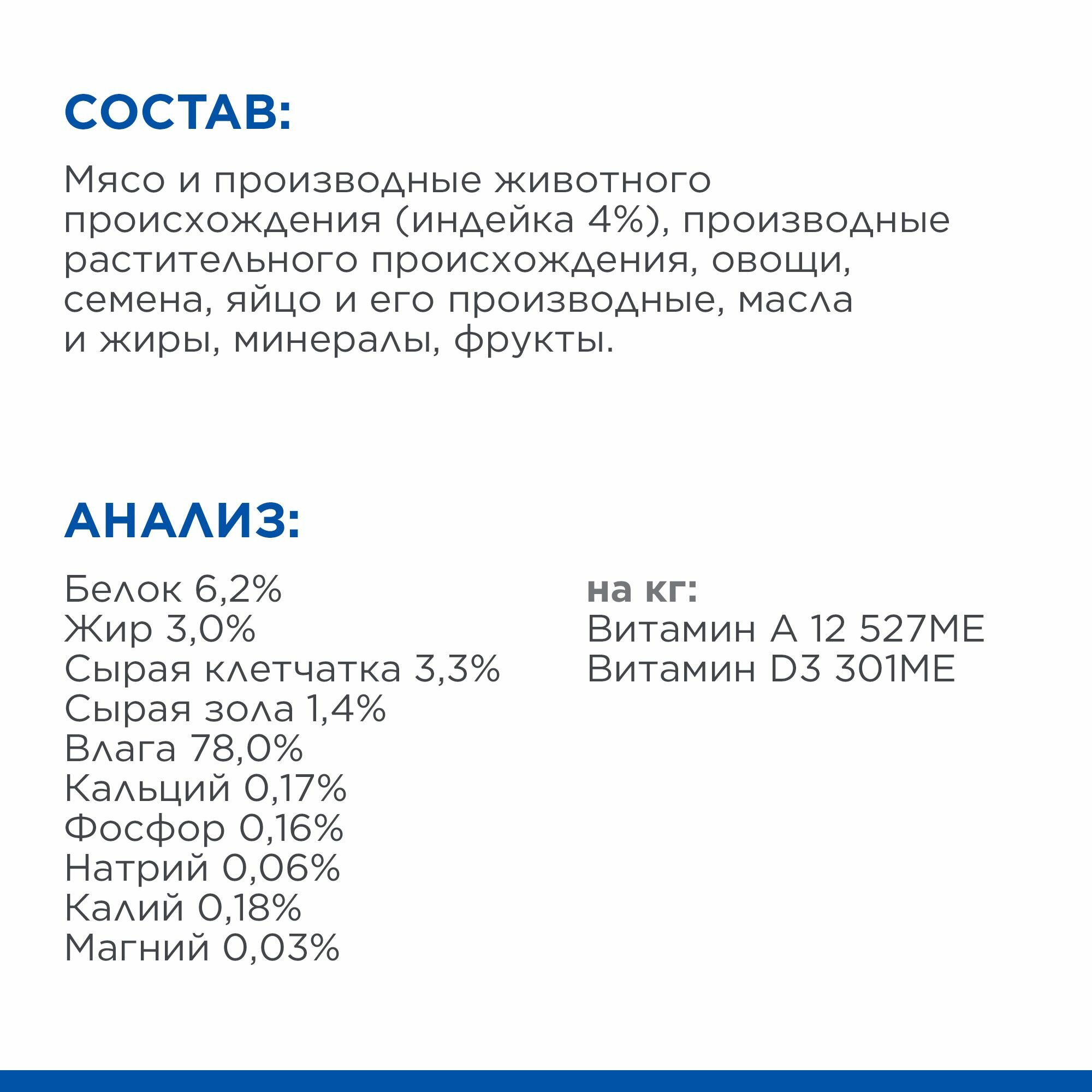 Влажный корм Hill's Science Plan Small&Mini Perfect Weight Мусс с индейкой - полноценный рацион с мягкой и нежной текстурой для взрослых собак мелких и миниатюрных пород в возрасте от 1 до 6 лет с небольшим избыточным весом или склонностью к набору веса. Этот рацион разработан с учетом уникальных потребностей собак мелких пород для поддержания оптимального веса, в том числе – долговременное В ассортименте Hill's Science Plan представлены сухие и влажные рационы для собак мелких и миниатюрных, с большим разнообразием восхитительных вкусов, которые точно понравятся вашему лучшему другу. - Формула с высоким содержанием белка и клетчатки, обогащенная L-карнитином и кокосовым маслом, помогает поддерживать метаболизм питомцев; - Мягкая муссовая текстура, обеспечивает вашего питомца необходимой энергией благодаря правильному сочетанию белков, жиров и углеводов; - Поддерживает иммунную систему благодаря мощному комплексу антиоксидантов.