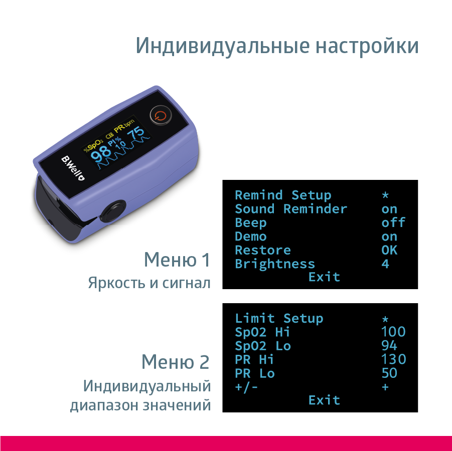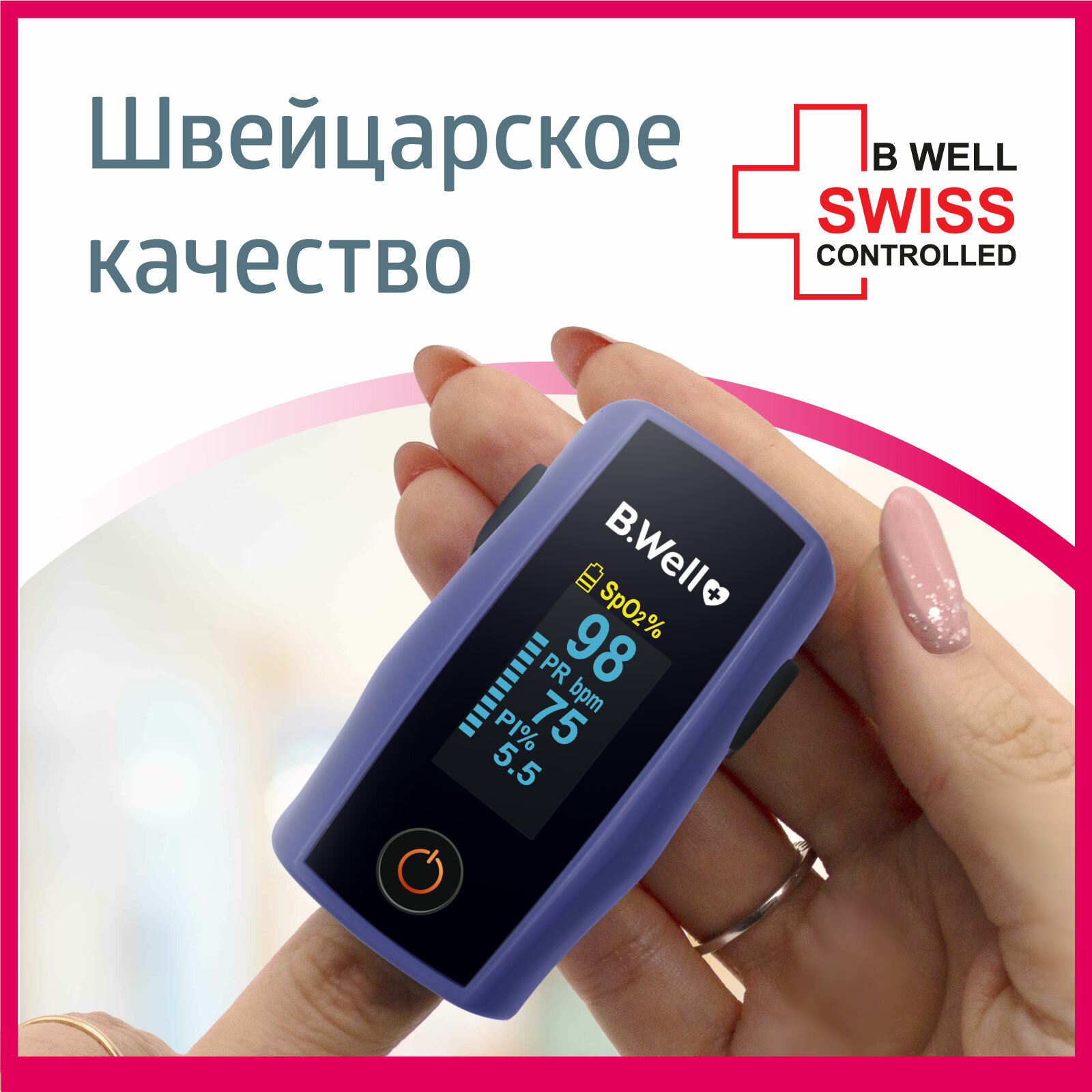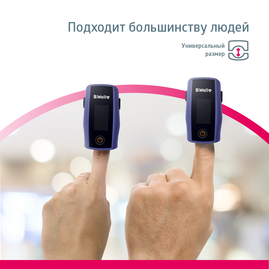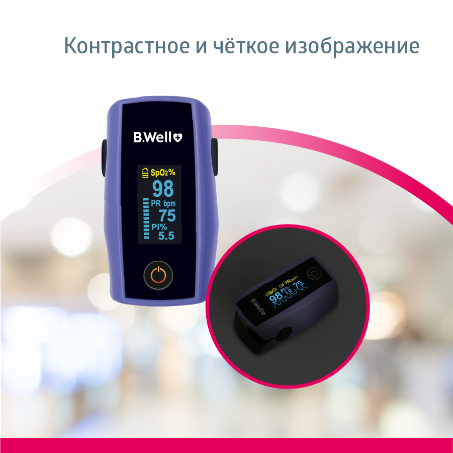 Пульсоксиметр B.Well : сатурация, индекс перфузии, частота пульса, стабилизация положения, универсальный размер. Описание пульсоксиметра B.Well : - индикатор ЖК двухцветный; - кислородная сатурация (SpO2) диапазон измерения от от 70% до 100%; - диапазон измерений частоты пульса (PR), уд/мин - от 30 до 250; - длина волны излучения - красный 660 нм. инфракрасный 905 нм. - подходит для непрерывного мониторинга; - график пульса; - индекс перфузии; - контрастный дисплей; - автономная работа от двух батареек тип ААА; - автоповорот дисплея в 6 плоскостях; - регулировка яркости; - низкое энергопотребление; - индикация заряда батареи; - допустимая длина окружности пальца для измерения: 20 - 75 мм.; - размеры: 63 X 36 X 34 мм.; Принцип действия: Принцип действия пульсоксиметра основан на том, что присутствующие в крови оксигемоглобин (гемоглобин, насыщенный кислородом, HbO?) и дезоксигемоглобин (оксигемоглобин, отдавший кислород клеткам организма, HbR) имеют различное поглощение света в красной и инфракрасной областях спектра. Оксигемоглобин HbO? преимущественно поглощает свет в инфракрасной области спектра (?=905 нм), а дезоксигемоглобин – в красной области спектра (?=660 нм). производит измерение по пальцу руки. В нижней части прибора встроены два светодиода, попеременно излучающие свет в красном и инфракрасном областях спектра. В верхней части находится сенсор с фоточувствительным элементом, регистрирующий прошедшее через палец излучение. По анализу поглощения излучения с красной и инфракрасной длинами волн вычисляется значение сатурации. Значение частоты пульса получают анализом пульсовой волны, характеризующей частоту сердечных сокращений во времени. Результаты анализа выводятся на дисплей в виде значений уровня сатурации и частоты пульса. Комплектация: - пульсоксиметр B.Well ; - шнурок для ношения; - батарейки ААА (2 шт.); - инструкция по эксплуатации; - гарантийный талон; - товарный и кассовый чек. Бивэл ( B.WellSwissAG, Швейцария ) Гарантия: 1 год + 5 лет бесплатное сервисное обслуживание