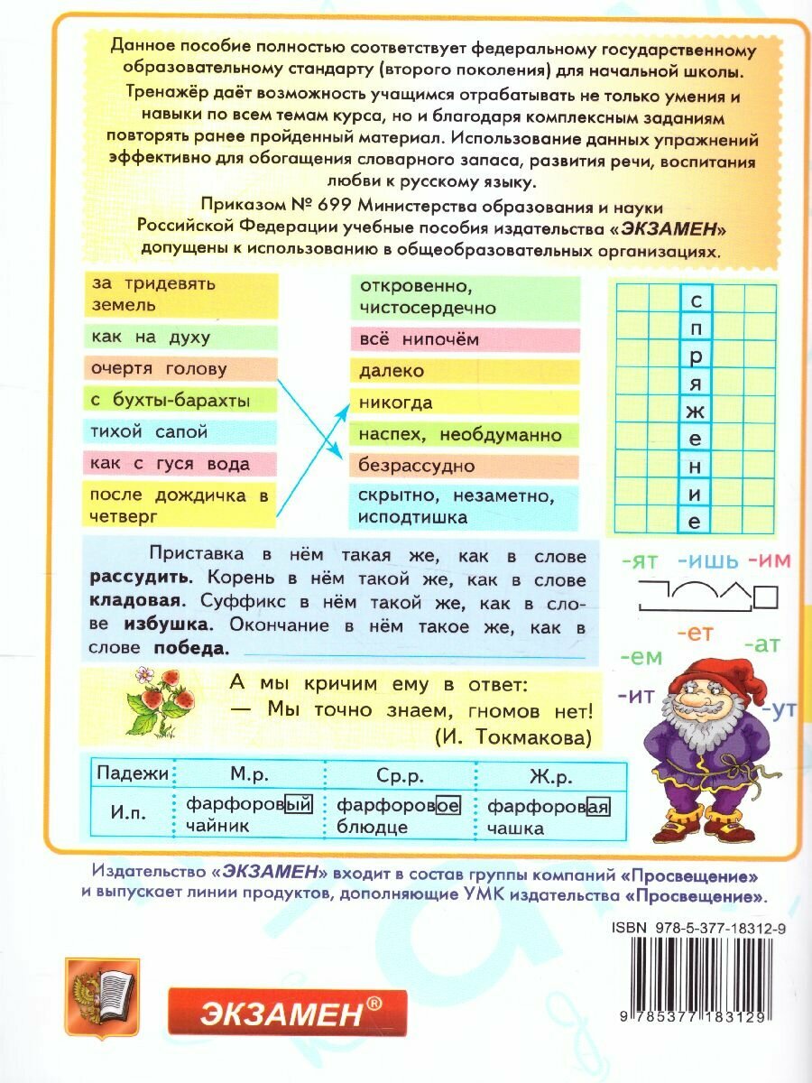 Данное пособие полностью соответствует федеральному государственному образовательному стандарту (второго поколения) для начальной школы. Тренажёр даёт возможность учащимся отрабатывать не только умения и навыки по всем темам курса, но и благодаря комплексным заданиям повторять ранее пройденный материал. Использование данных упражнений эффективно для обогащения словарного запаса, развития речи, воспитания любви к русскому языку. Пособие предназначено для учащихся, учителей начальной школы и родителей, которые хотят помочь своим детям преодолеть трудности в освоении программы.