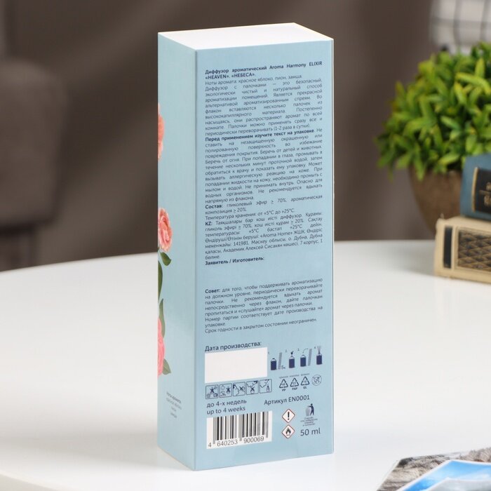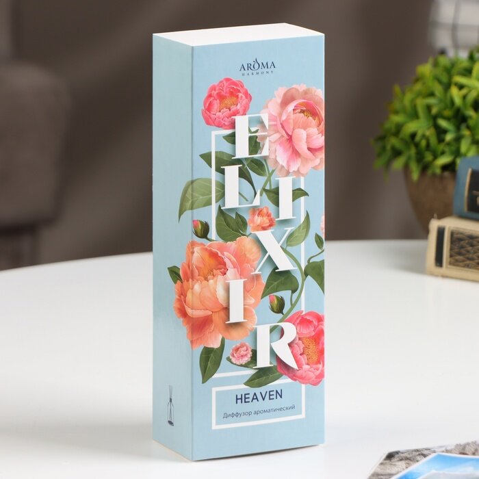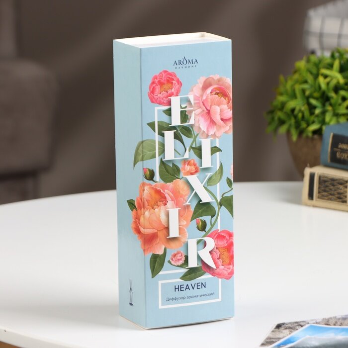 **Ароматический диффузор Aroma Harmony Elixir Heaven** — удобное и простое в использовании приспособление, при помощи которого можно создать комфортную атмосферу в доме. Аксессуар источает приятный, легкий аромат, наполняющий атмосферу свежестью и уютом. Способ применения максимально простой — достаточно открыть упаковку, извлечь бутылочку и вставить в нее палочки. Чем больше последних, тем насыщеннее распространяемый аромат и, наоборот.