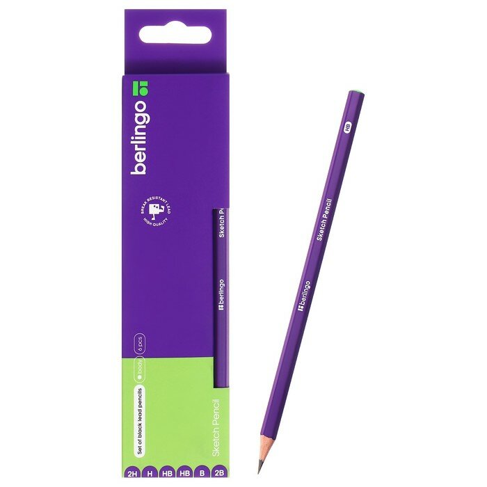Набор чернографитных ударопрочных карандашей Berlingo "Sketch Pencil", с заточкой, 6шт. Изготовлены из липы высшего качества, специально обработанной для идеальной заточки. Премиальные грифели оставляют яркий след на бумаге и идеально стираются. Подходят для рисования и профессионального черчения. В наборе твердости: 2H, H, HB (2шт), B, 2B. Грифели проклеены по всей длине, не ломаются при падении. Закругленный, обработанный срез каждого карандаша. Безопасны для детей. Шестигранная форма. Упаковка в матовую soft-touch коробку с европодвесом.