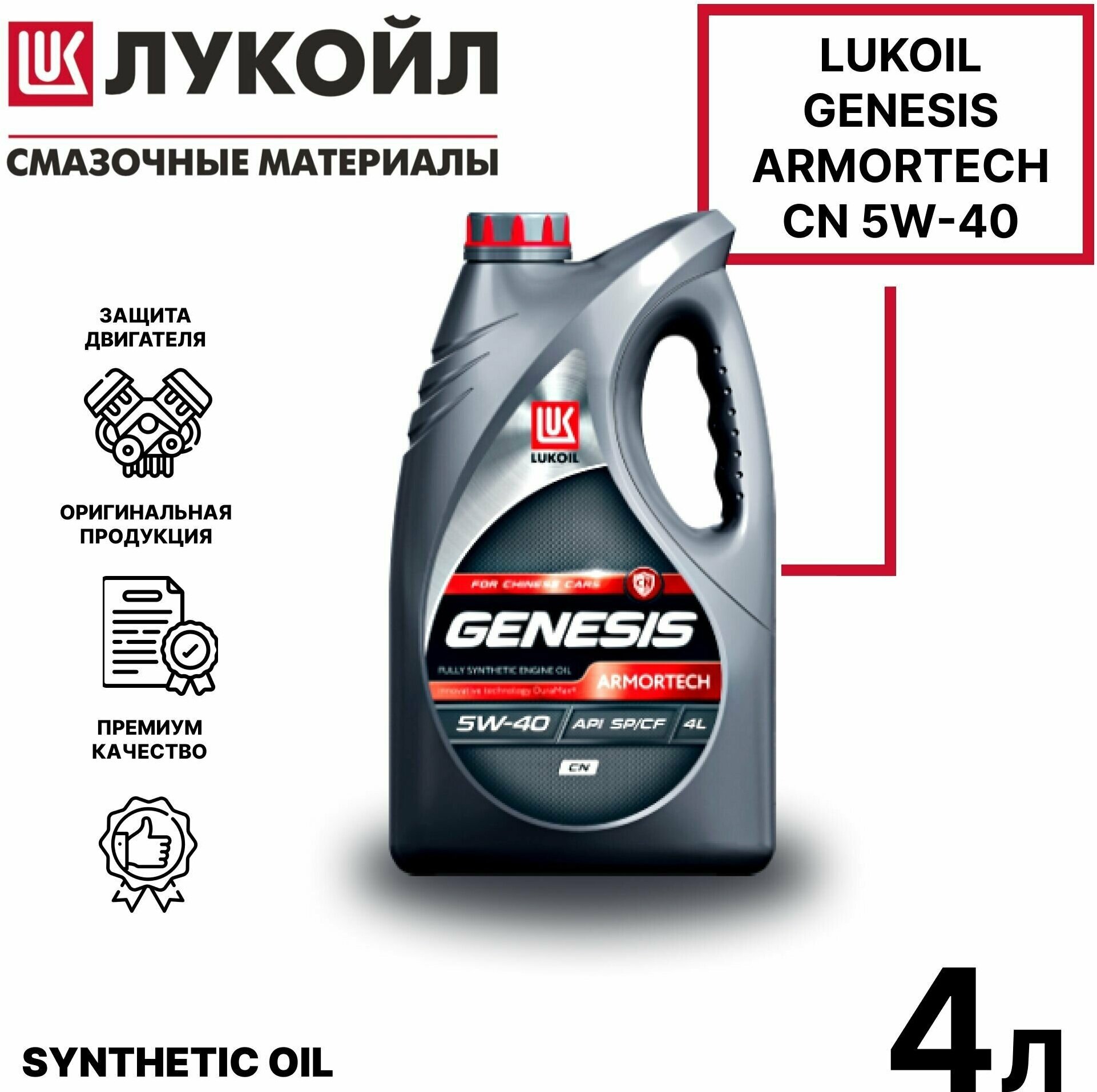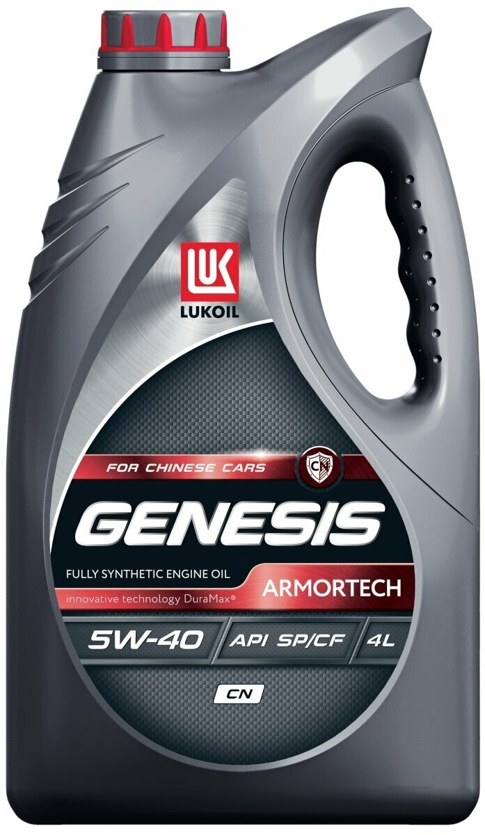 LUKOIL GENESIS ARMORTECH CN 5W-40 синтетическое моторное масло для современных бензиновых и дизельных двигателей легковых автомобилей китайских брендов. Производится с применением передовой технологии DuraMax и обеспечивает эффективную работу мощных модернизированных двигателей китайских автомобилей, оснащенных турбонаддувом, благодаря повышенной защите от изноcа и отложений. Технология продукта также адаптирована для двигателей с непосредственным впрыском и предотвращает возникновение эффекта преждевременного воспламенения топливовоздушной смеси (LSPI).