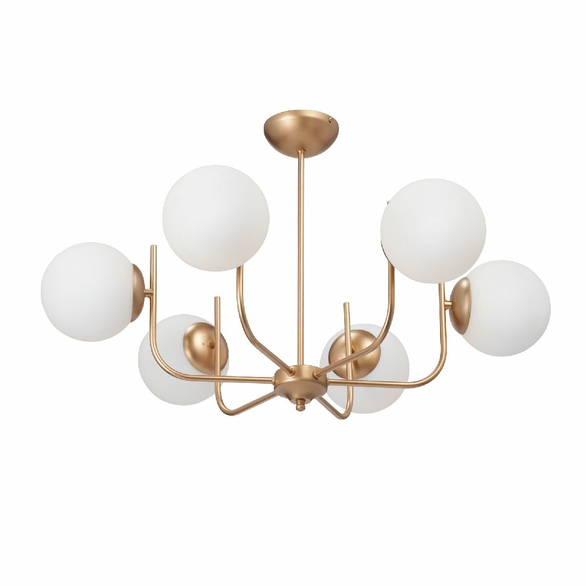 золотая люстра на штанге с белыми плафонами шар, предназначена для потолочного монтажа, оснащена шестью лампами с цоколем e14 или e27, максимальная мощность лампы 40 вт, общая мощность 240 вт.