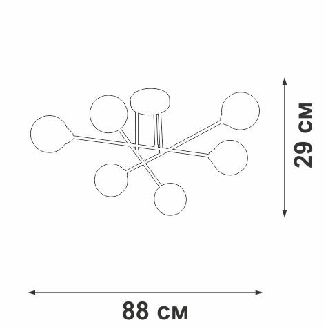 длина 88 см, ширина 88 см, высота 29 см. стиль — модерн, подходит для гостиной. крепление потолочное, питание от сети 220 в. цвет плафонов — белый, материал основания не указан. комплектация не включает лампы. упаковка — картонная коробка.