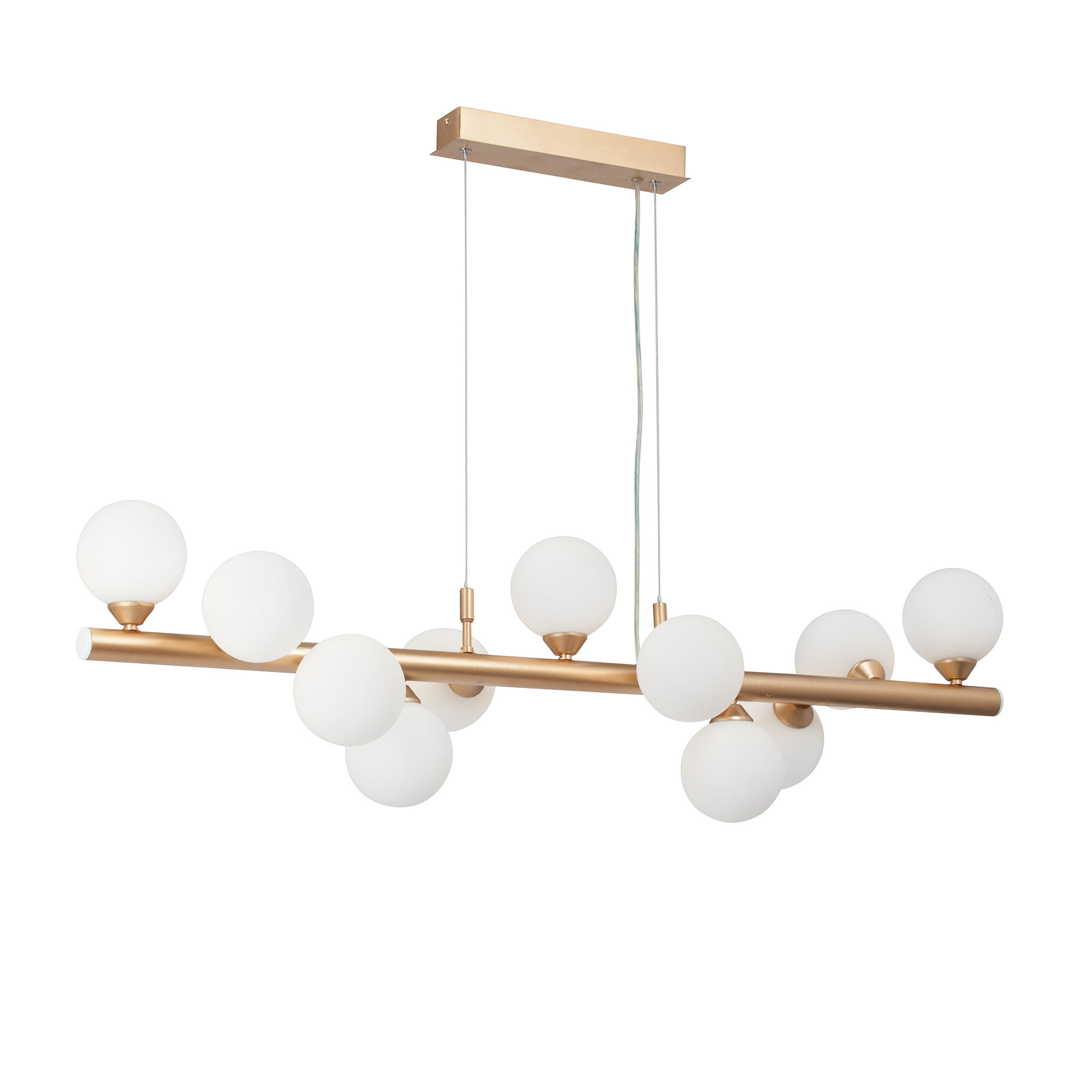 подвесная люстра vitaluce с 11 галогеновыми лампами мощностью до 28 вт каждая, выполнена в стиле модерн с металлическим золотистым основанием и белыми стеклянными плафонами, высота 108 см, ширина 32 см, вес 5,1 кг, подходит для гостиной и обеспечивает освещение до 33 кв.м
