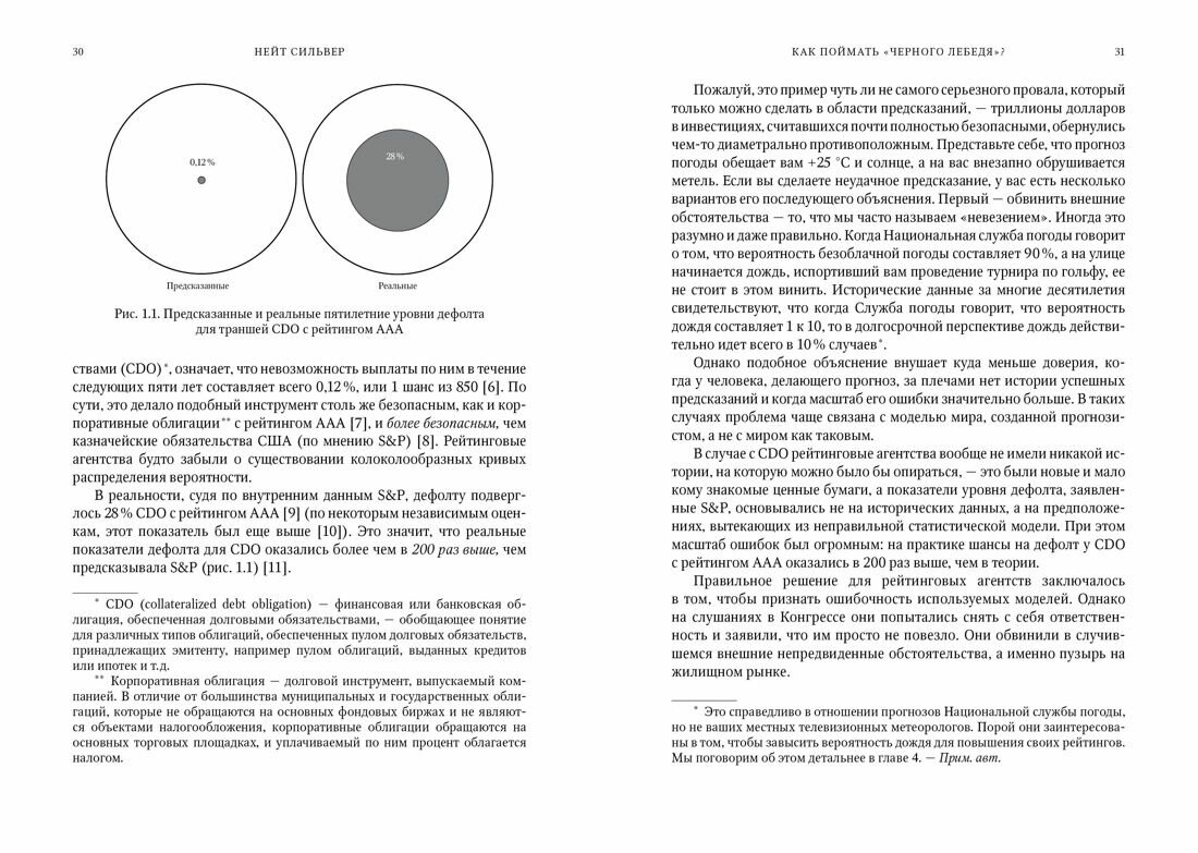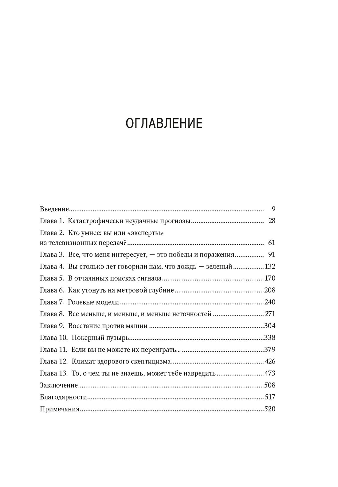 Большинство прогнозов, касающихся экономики, политики, чрезвычайных ситуаций и других сфер, терпят неудачу из-за неверной оценки вероятностей в условиях неопределенности. Часто мы ошибочно принимаем более уверенные прогнозы за более точные, при этом чрезмерная уверенность оборачивается фиаско. Только углубив понимание случайности и неопределенности, мы сможем сделать наши прогнозы более близкими к истине. Нейт Сильвер, основатель и главный редактор сайта FiveThirtyEight, опираясь на свою инновационную систему прогнозирования результатов в спорте и политике, показывает, как извлечь истинный сигнал из массива побочных данных — информационного «шума». Сильвер рассматривает наиболее точные прогнозы в самых разных областях: от стихийных бедствий до пандемий, от покерного стола до фондового рынка, от глобального потепления до спорта. Он анализирует, как мыслят самые успешные прогнозисты и что их объединяет. В чем причина их успеха? Они подкованы лучше других — или им просто повезло? Какие закономерности они раскрывают? И действительно ли верны их прогнозы? Сильвер отмечает, что авторы лучших прогнозов превосходно владеют вероятностными инструментами. Они отличают предсказуемое от непредсказуемого и замечают множество мелких деталей, которые приближают их к истине. Благодаря верной оценке вероятностей они могут отличить сигнал от шума. Книга Нейта Сильвера, во многом созвучная идеям Нассима Талеба, помогает достойно встретиться с «черными лебедями» и столь же значима для всех, кто имеет дело с большими данными и просчитывает варианты развития событий.
