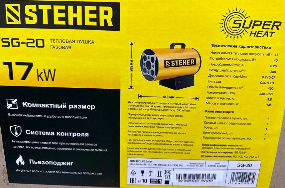 STEHER (Стехер) – это газовая пушка с высоким уровнем КПД, системой контроля пламени и надежным пьезоподжигом. Модель заключена в компактный корпус, изготовленный из прочного листового металла и дополненный двойным теплоэкранированием. Спереди имеется защитная решетка, не позволяющая попадать внутрь никаким посторонним предметам.