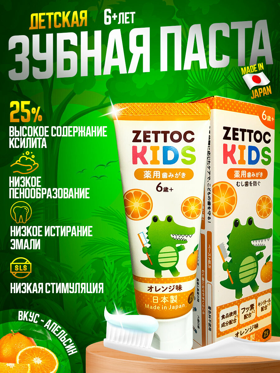 Японская зубная паста детская с фтором ZETTOC KIDS 6+ лет со вкусом апельсина, фтором и ксилитом снижает риск развития кариеса и реминерализирует эмаль. Высокое содержание ксилита блокирует развитие бактерий, вызывающих кариес. Ксилит изготавливается из растительного сырья берёзовой древесины, миндальной шелухи, соломы, кукурузы.активные компоненты И преимущества- CPC — оказывает антисептический эффект, уменьшает грибковую, бактериальную и вирусную нагрузку в полости рта, предотвращает развитие инфекционных воспалений. CPC достигает каждого уголка рта, эффективно уничтожая нежелательные бактерии, эффективно защищая от кариеса.- двойной кремний (SILICA) и гелевая форма пасты тщательно и мягко очищают зубы от налета.- ETHYLPARABEN — составе обладает сильным антимикробным и антисиптическими свойствами.- фтор (SODIUM FLUORID) — 600 ppm солей фтора защищает от кариеса и способствует реминерализации эмали.Специально разработано для детей, которые уже научились чистить зубы, но не готовы к взрослым пастам. Не содержит синтетических красителей, мяты, алкоголя. Приятные ароматы и вкусы апельсина и колы понравятся детям. Первые постоянные зубы обычно вырастают в возрасте от 6 до 7 лет. Используйте зубную пасту ZETTOC KIDS для детей от 6 лет и старше, чтобы предотвратить кариес и укрепить зубы с помощью CPC и фтора.