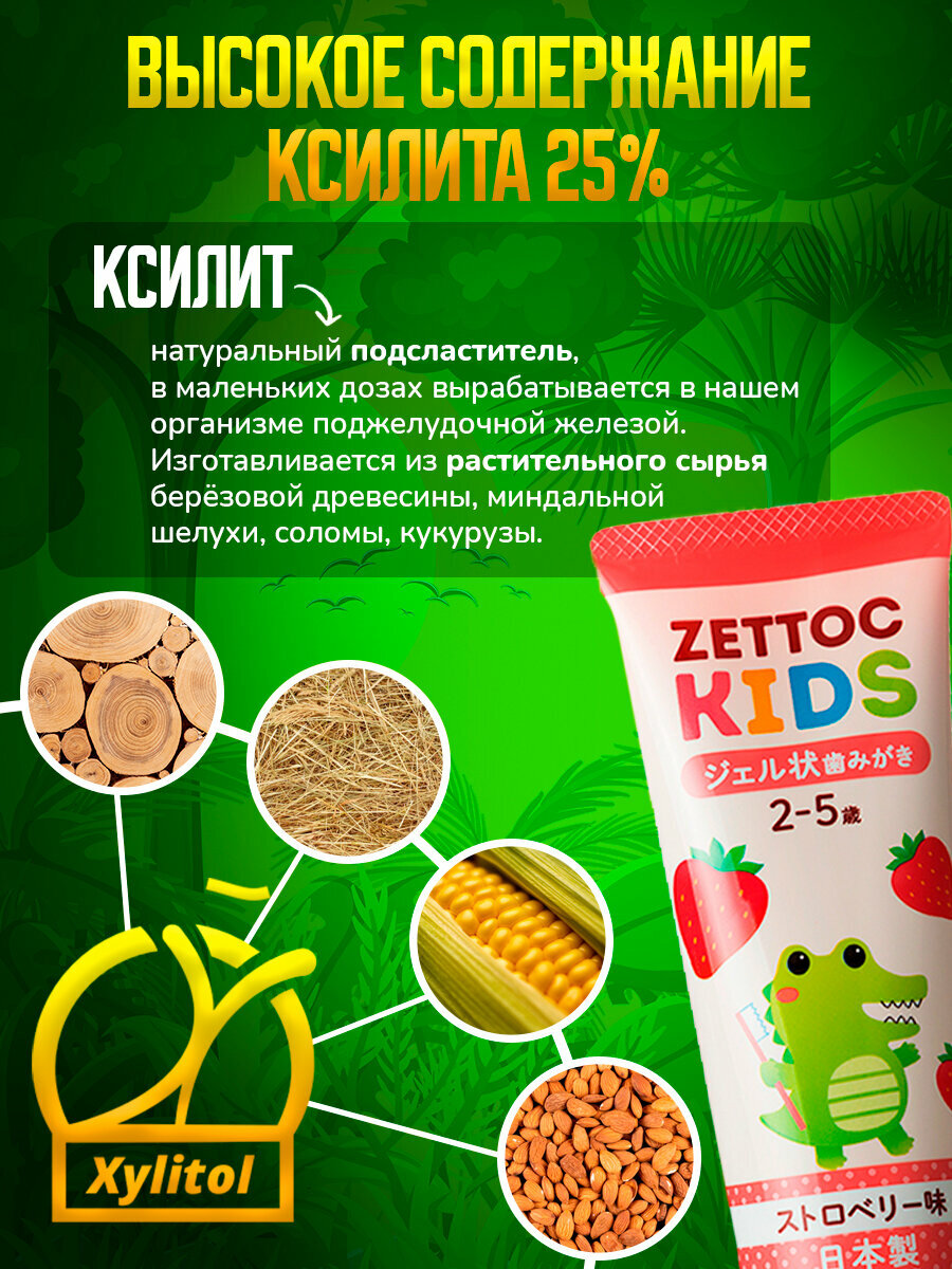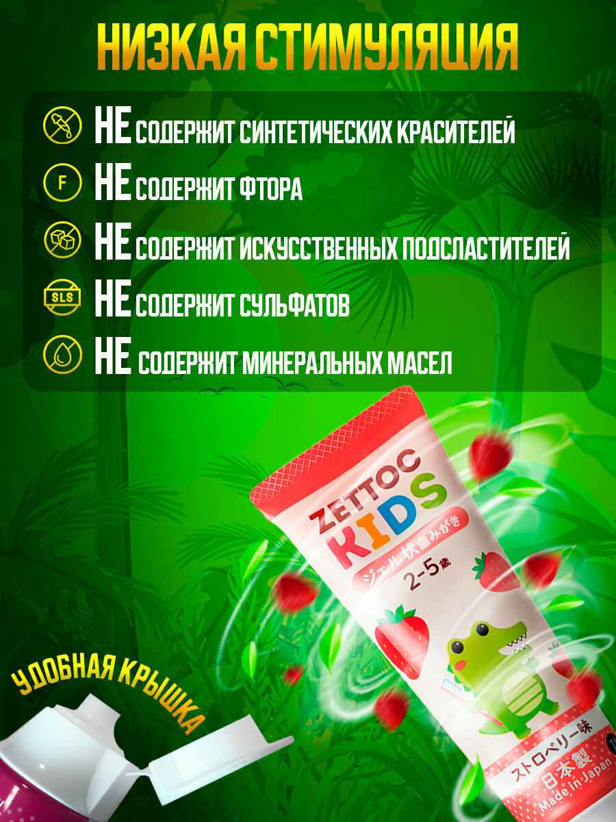 Японская зубная паста детская без фтора ZETTOC KIDS 2-5 лет со вкусом клубники. Высокое содержание ксилита блокирует развитие бактерий, вызывающих кариес. Ксилит изготавливается из растительного сырья берёзовой древесины, миндальной шелухи, соломы, кукурузы.активные компоненты И преимущества- CPC — оказывает антисептический эффект, уменьшает грибковую, бактериальную и вирусную нагрузку в полости рта, предотвращает развитие инфекционных воспалений. CPC достигает каждого уголка рта, эффективно уничтожая нежелательные бактерии, эффективно защищая от кариеса.- двойной кремний (SILICA) и гелевая форма пасты тщательно и мягко очищает зубы от налета.- ETHYLPARABEN в составе обладает сильным антимикробным и антисиптическими свойствами.Низкое пенообразование из-за отсутствия сульфатов помогает детям освоить технику чистки зубов. Откидная крышка позволяет ребенку самому справляться с открытием тюбика, приучая к самостоятельности. Содержит ингредиенты, используемые в пищевых продуктах, специально разработаны для детей, не привыкших чистить зубы.Не содержит синтетических красителей, фтора, искусственных подсластителей, SLS и минеральных масел. Приятный аромат и вкус клубники выбран детьми. Начните использовать эту пасту при переходе с детского питания на столовое. Чистка зубов — важная жизненная привычка, которой родители должны учить маленьких детей с самого раннего возраста, чтобы их зубы были здоровыми и чистыми.
