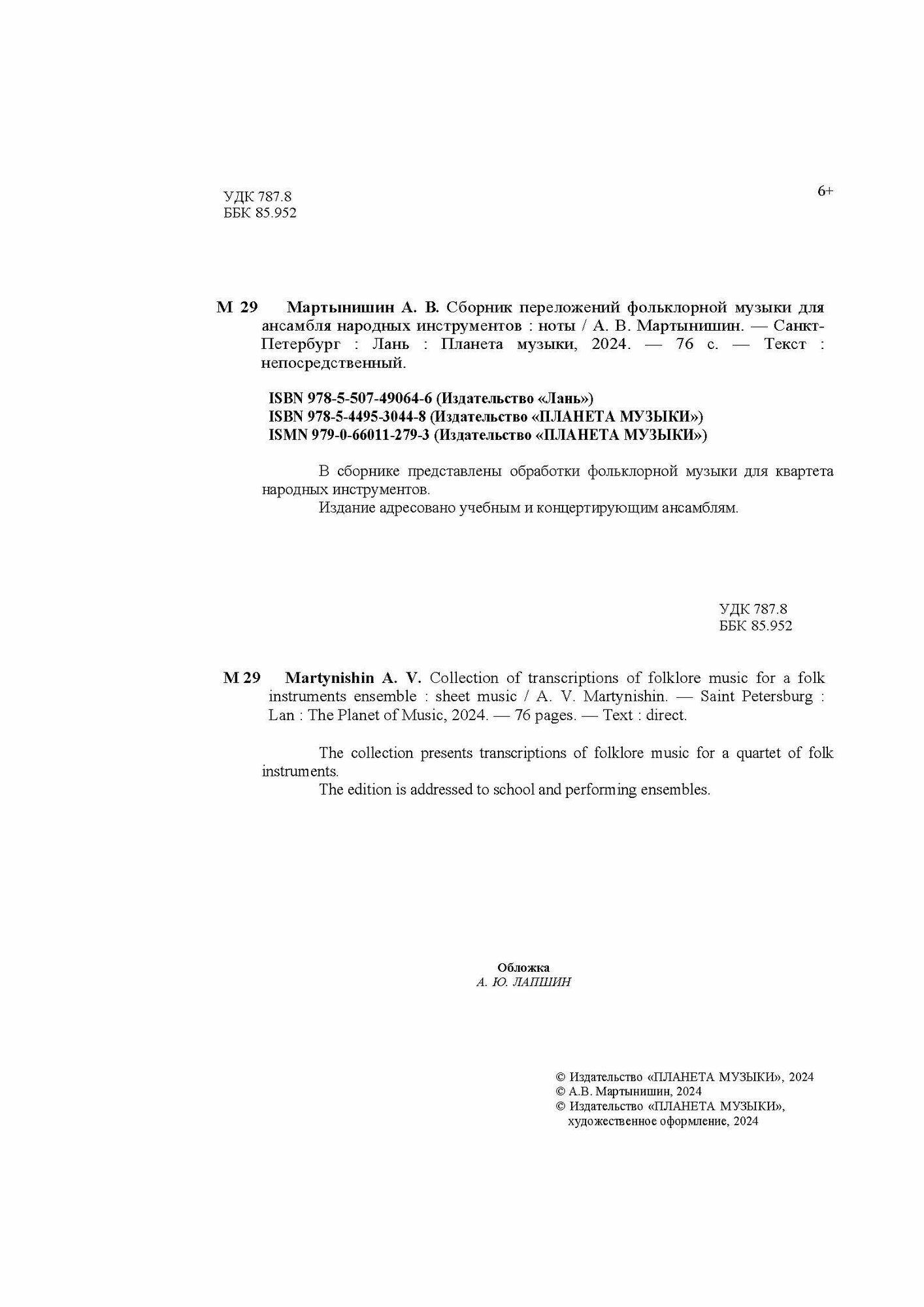Сборник переложений фольклорной музыки для ансамбля народных инструментов. Ноты (А. В. Мартынишин); Издательство «Планета музыки», 2024