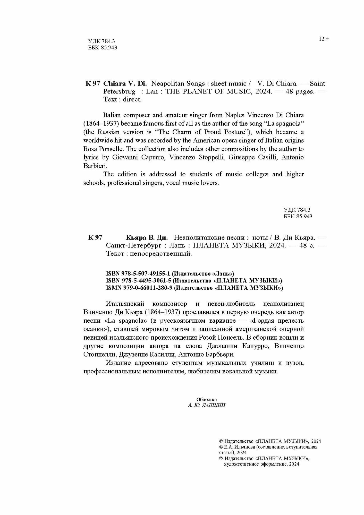 Итальянский композитор и певец-любитель неаполитанец Винченцо Ди Кьяра (1864-1937) прославился в первую очередь как автор песни «La spagnola» (в русскоязычном варианте - «Гордая Прелесть Осанки»), ставшей мировым хитом и записанной американской оперной певицей итальянского происхождения Розой Понсель. В сборник вошли и другие композиции автора на слова Джованни Капурро, Винченцо Стоппелли, Джузеппе Касилли, Антонио Барбьери. Издание адресовано студентам музыкальных училищ и вузов, профессиональным исполнителям, любителям вокальной музыки.