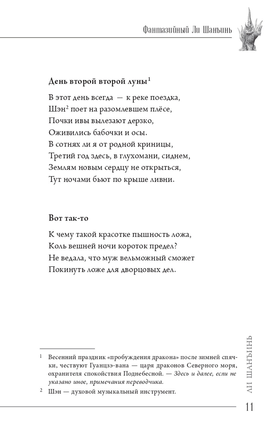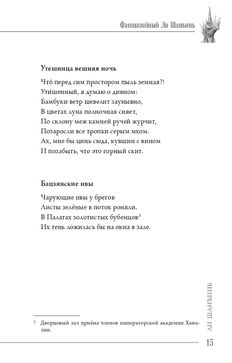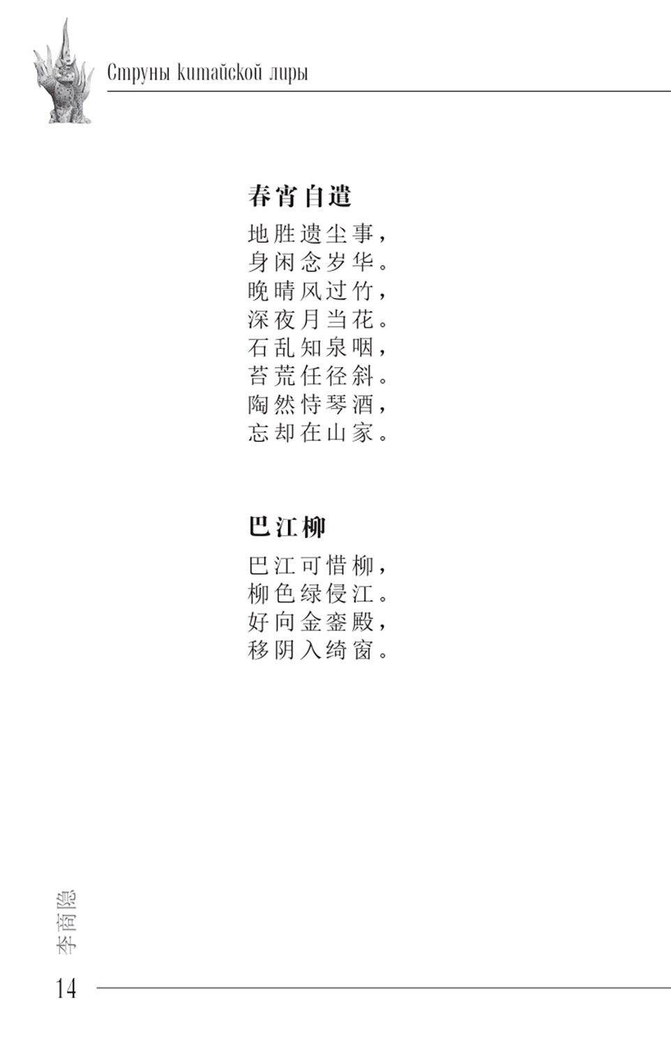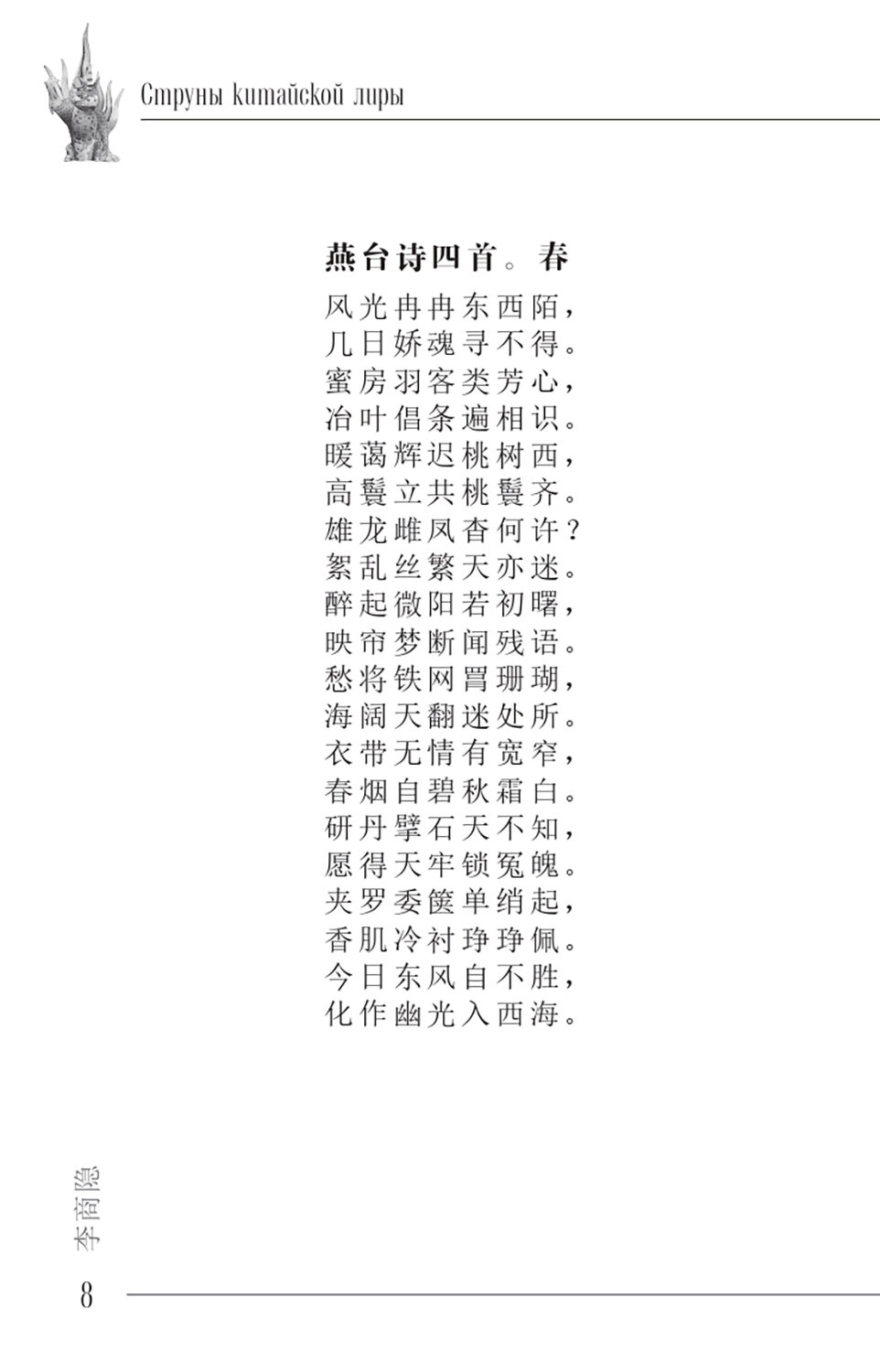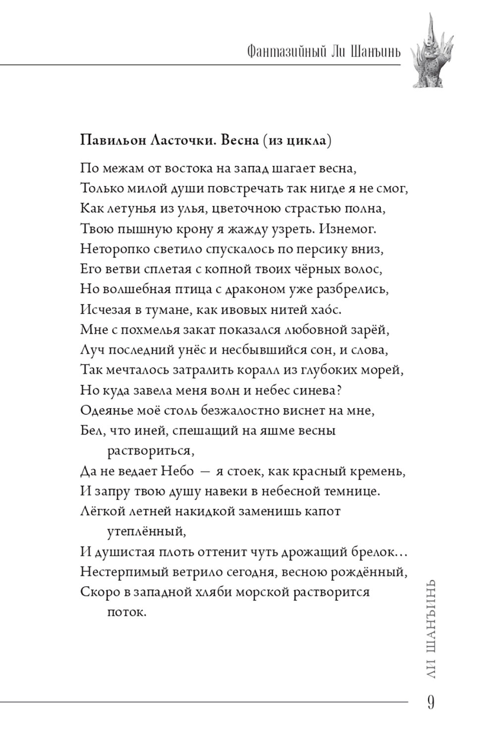Великого поэта Ли Шанъиня (813-858), жившего на век позднее Ли Бо, потомки называют «младшим Ли» и ставят его в один ряд с гениальным предшественником. Охарактеризовать его творчество можно как «барoчное»: эмоциональная экспрессия, яркая образность, неудержимая фантазия, театрализованная декоративность. Комментаторы, исходящие из «биографического метода» - привязки стихотворений к жизненным коллизиям автора, - считают его произведения «загадочными», но непредвзятый читатель видит, что стихи Ли Шанъиня чисты и прозрачны. Однако «загадочность» катастрофически помешала процессу их перевода не только на русский язык, но и на английский. Настоящий сборник (около 120 произведений) должен заполнить эту лакуну, совершенно не адекватную значительности Ли Шанъиня в истории мировой культуры.